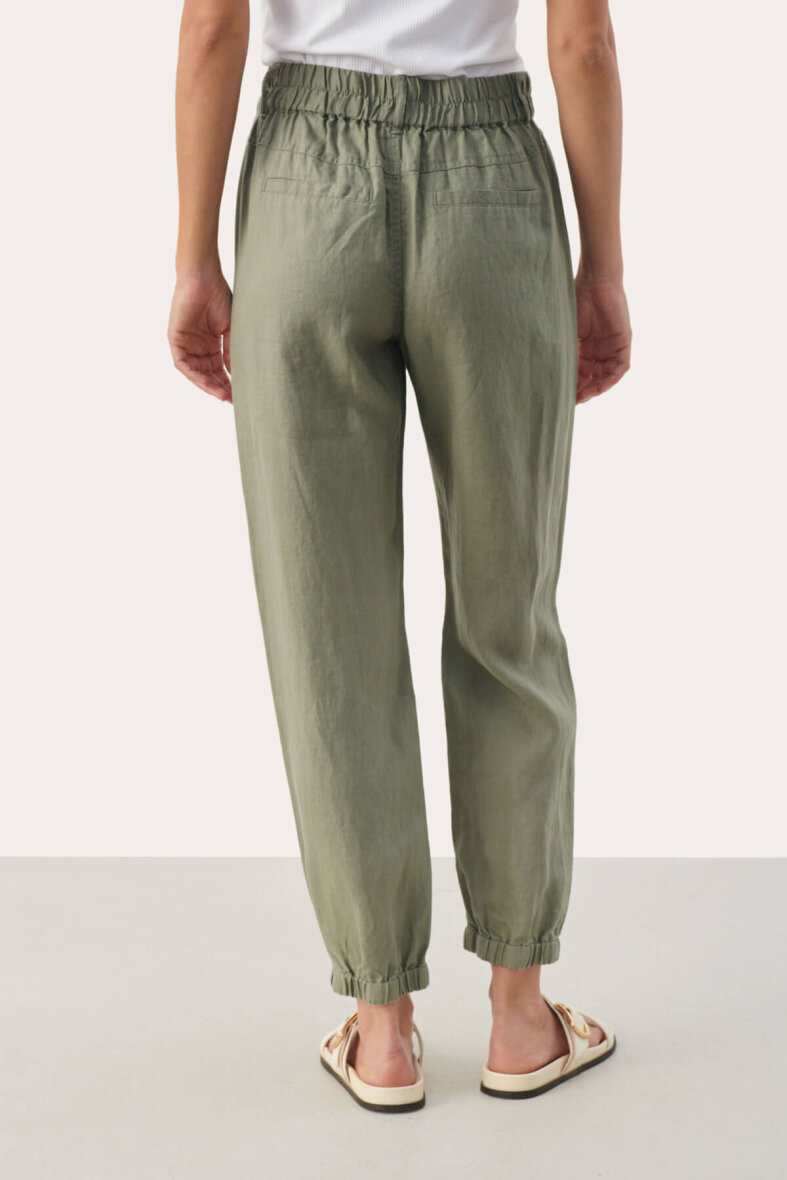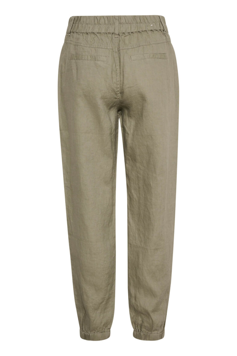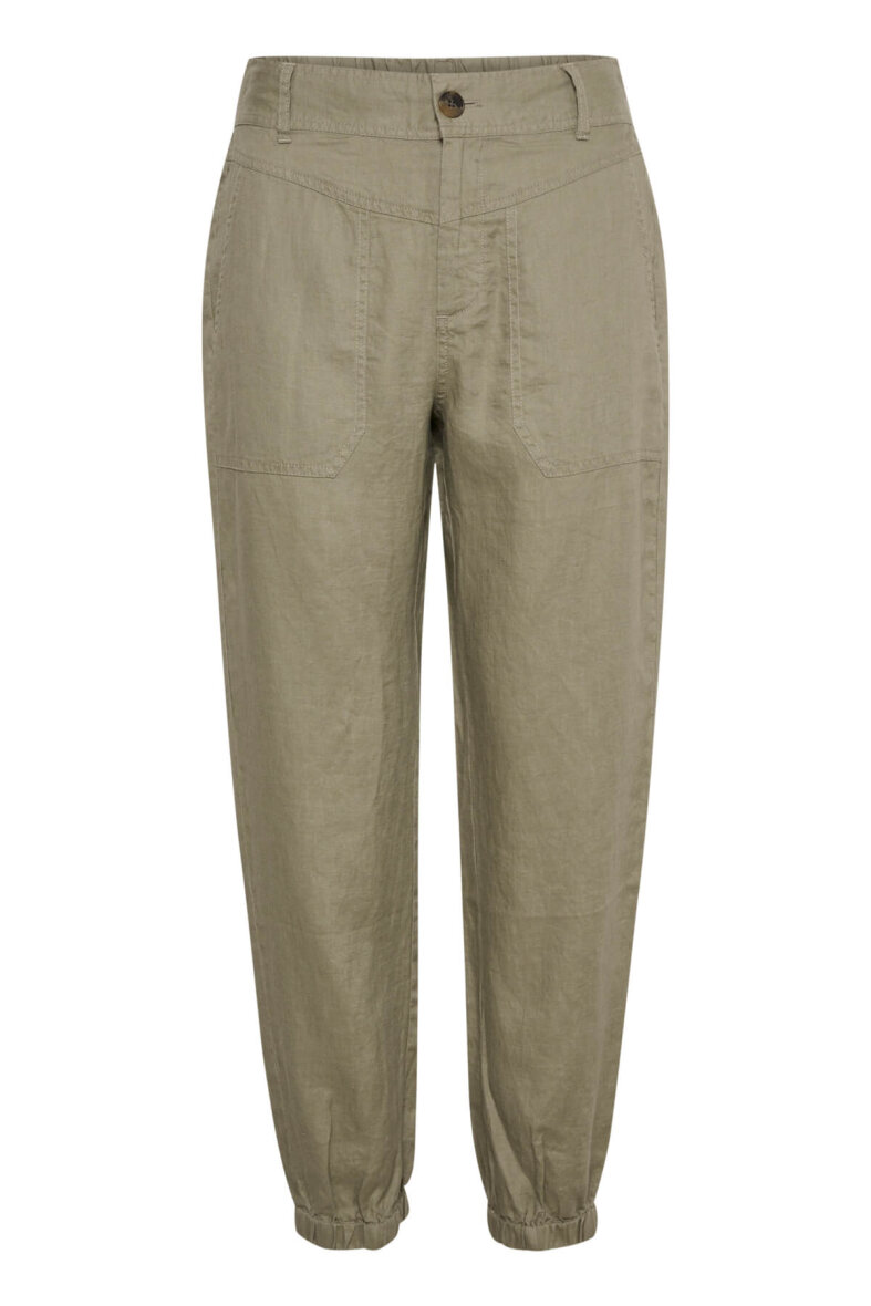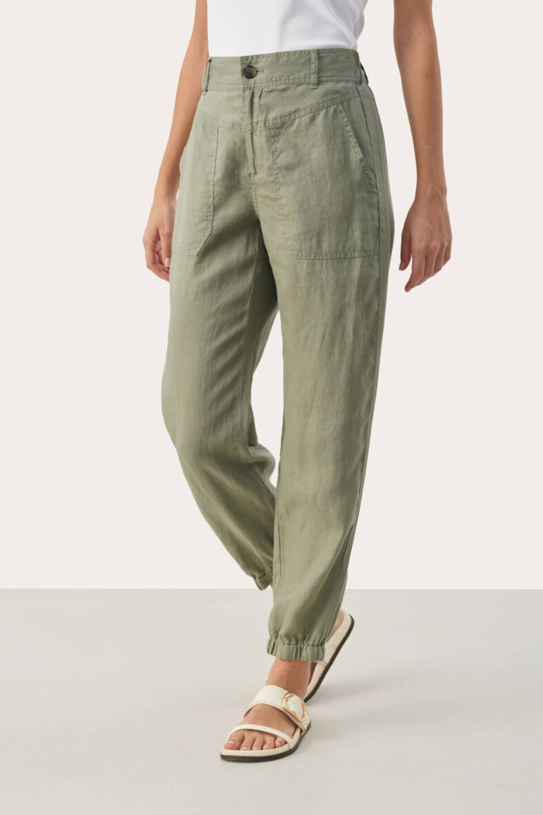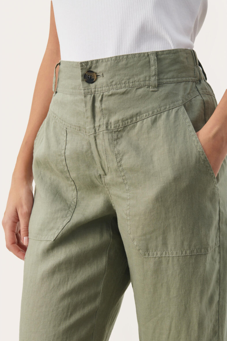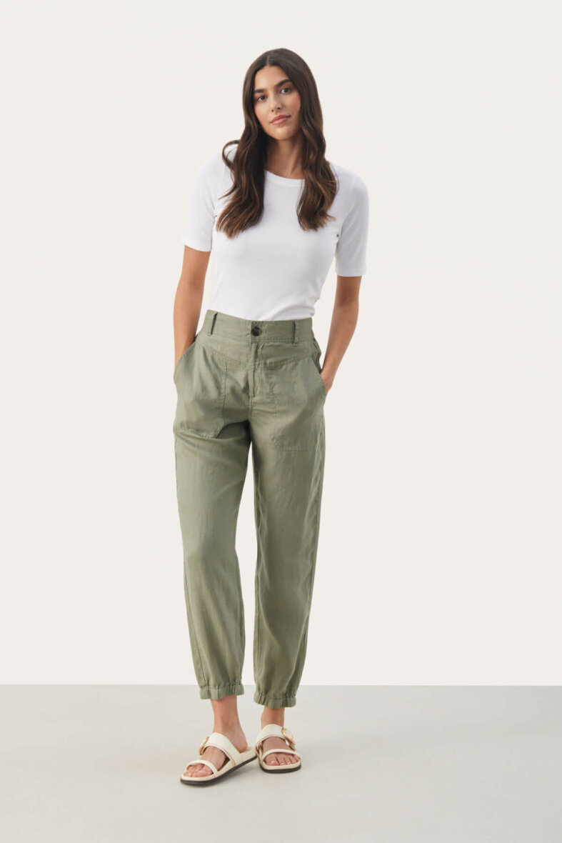 Flotte bukser fra Part Two i en skøn støvet army grøn farve. Busken er med knapluk og lynlås foran. Buksen er med bæltestropper, skrålommer foran og pyntelommer bagpå.