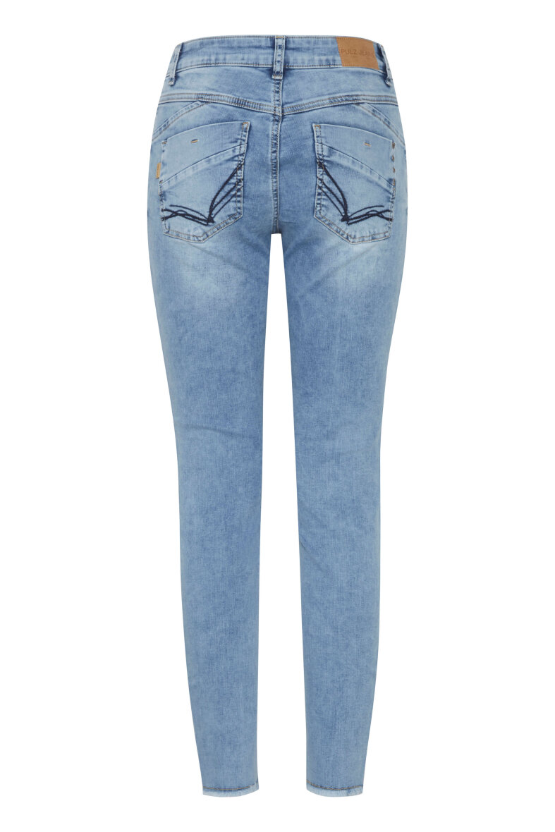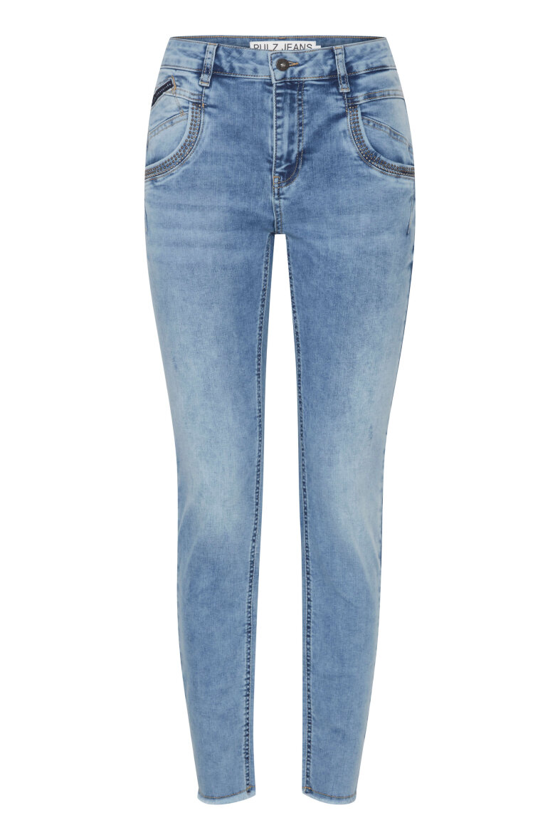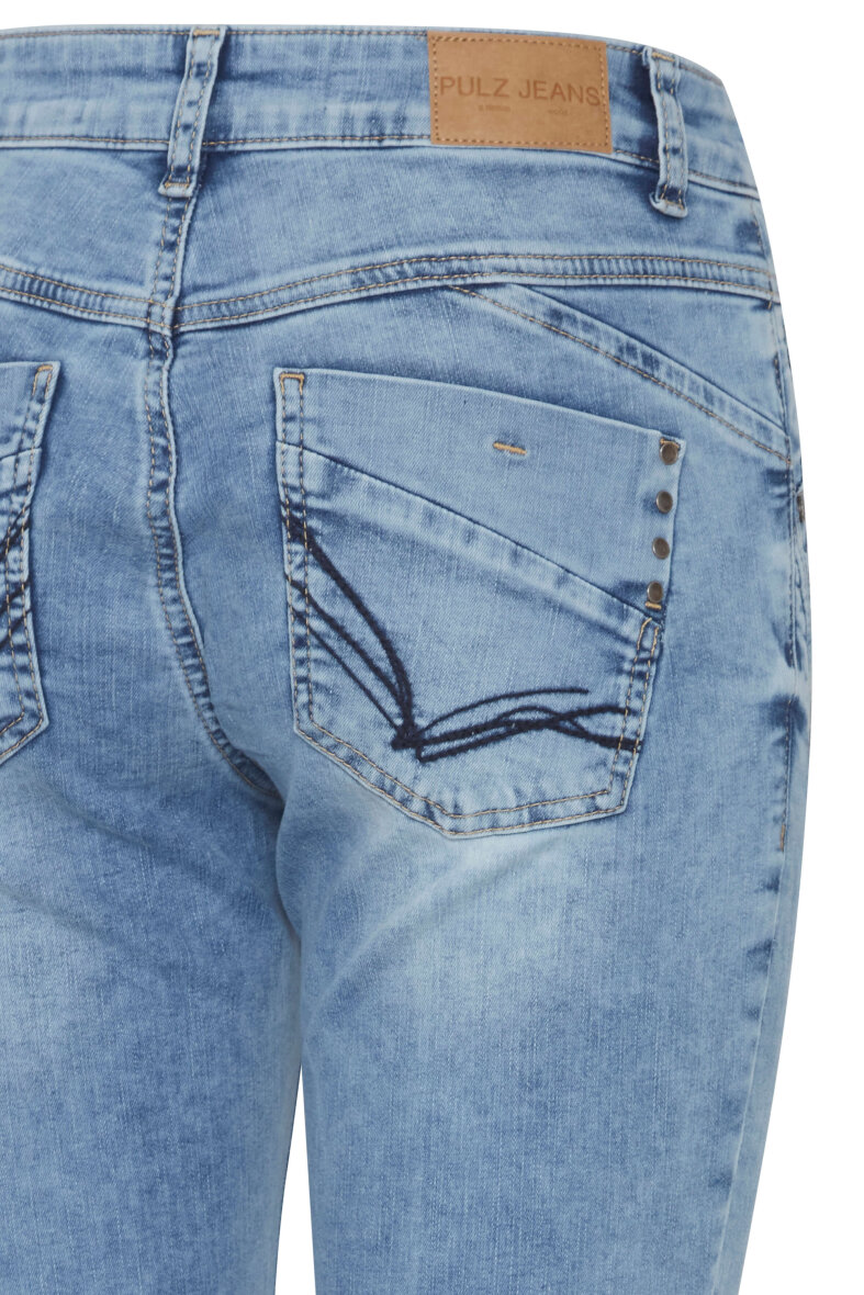 Smarte højtaljede skinny leg bukser fra PULZ JEANS i modellen Carmen. Buksen er lavet i et klassisk jeans design med knap- og lynlåsluk foran, bælte stropper og 5-lommer. Buksen er med fine detaljer ved lommerne såsom nitter langs lommeåbningen foran samt synings detalje på baglommerne.