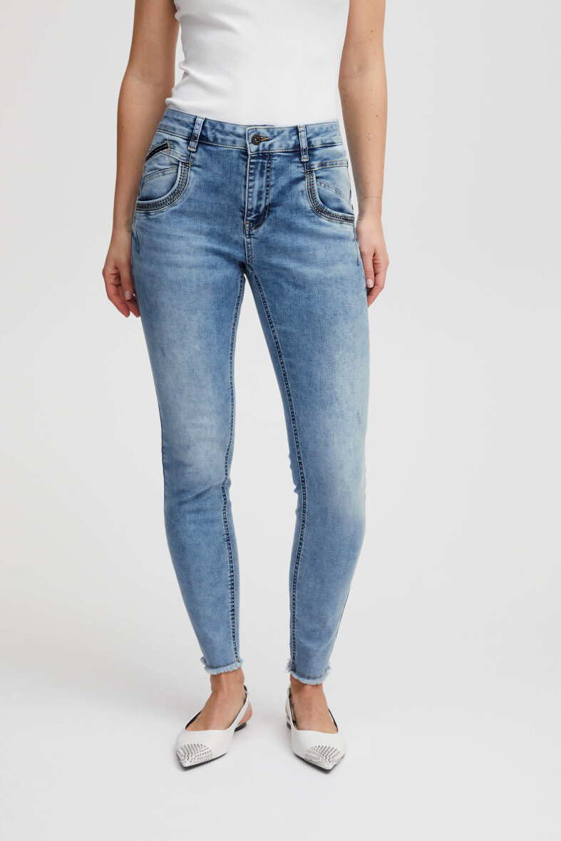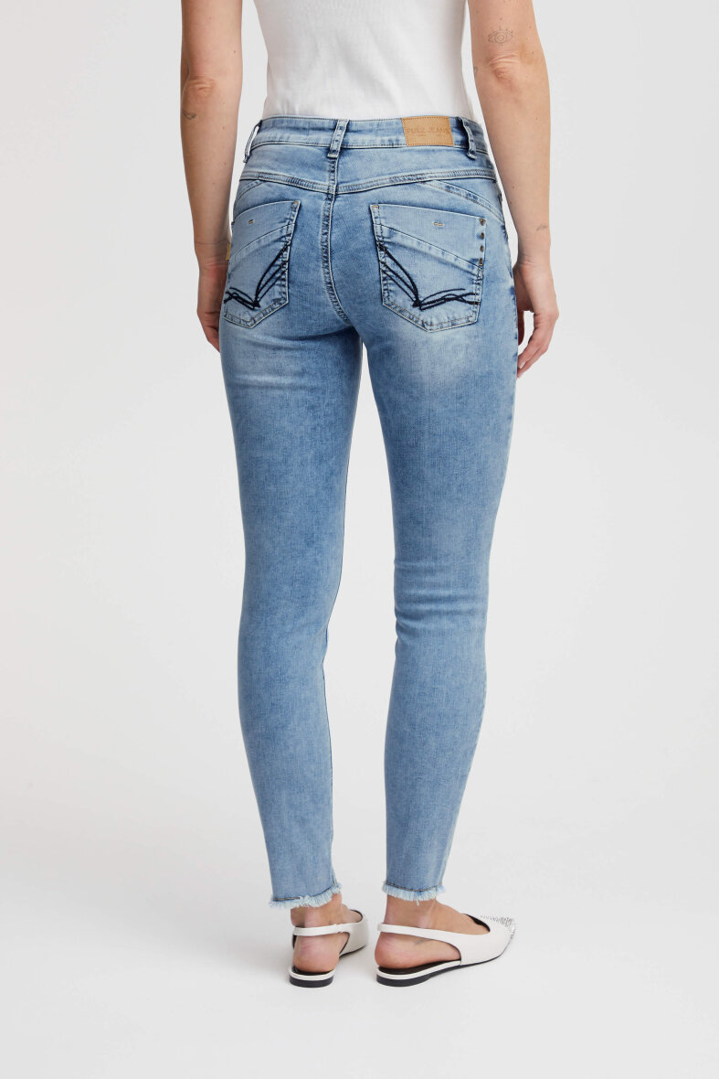 Buksen er en 7/8 længde med en smart frynse detalje ved buksebenet. Buksen er en højtaljet skinny leg, hvor pasformen er tætsiddende.
