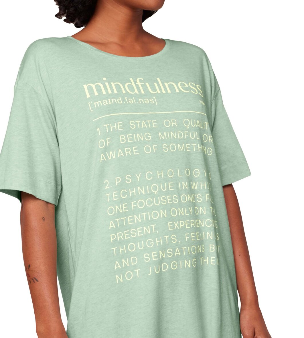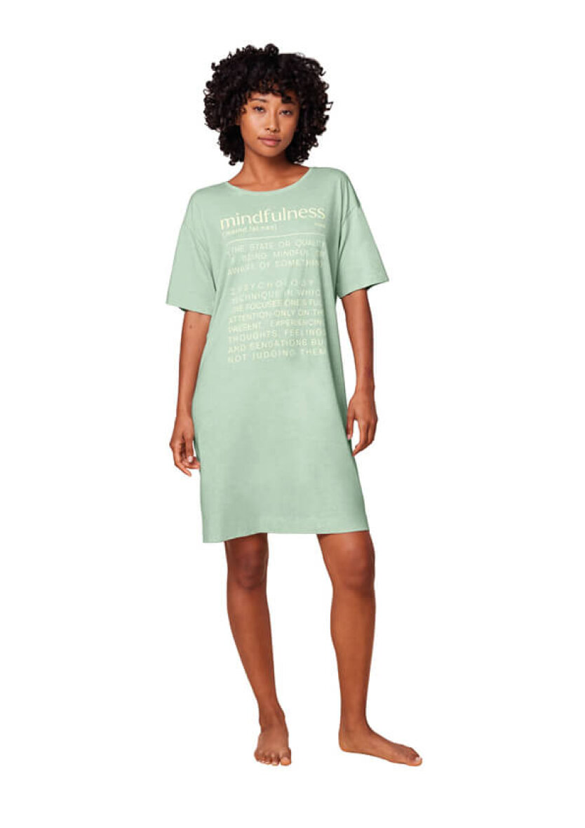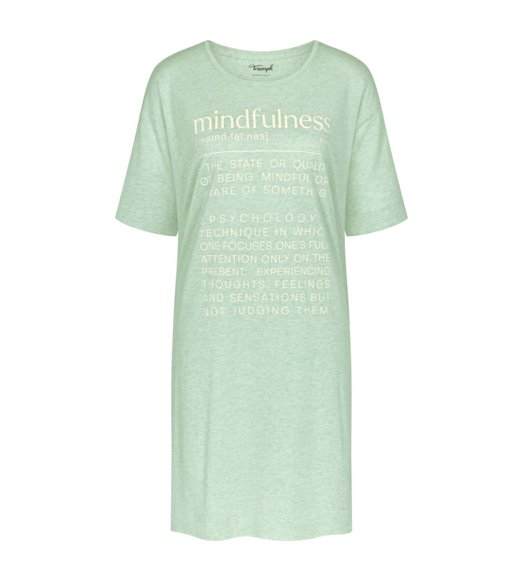 Flot lysegrøn natkjole fra Triumph. Natkjolen er med tryk på fronten af ordet "Mindfulness", med beskrivelse som i en ordbog.