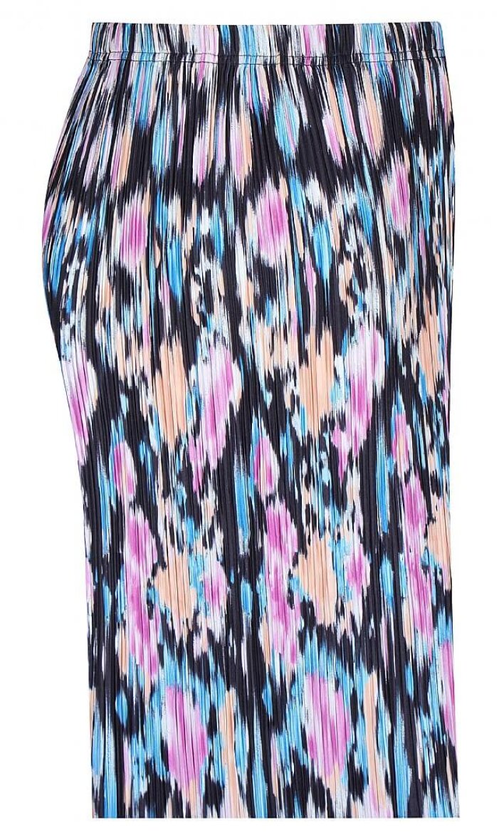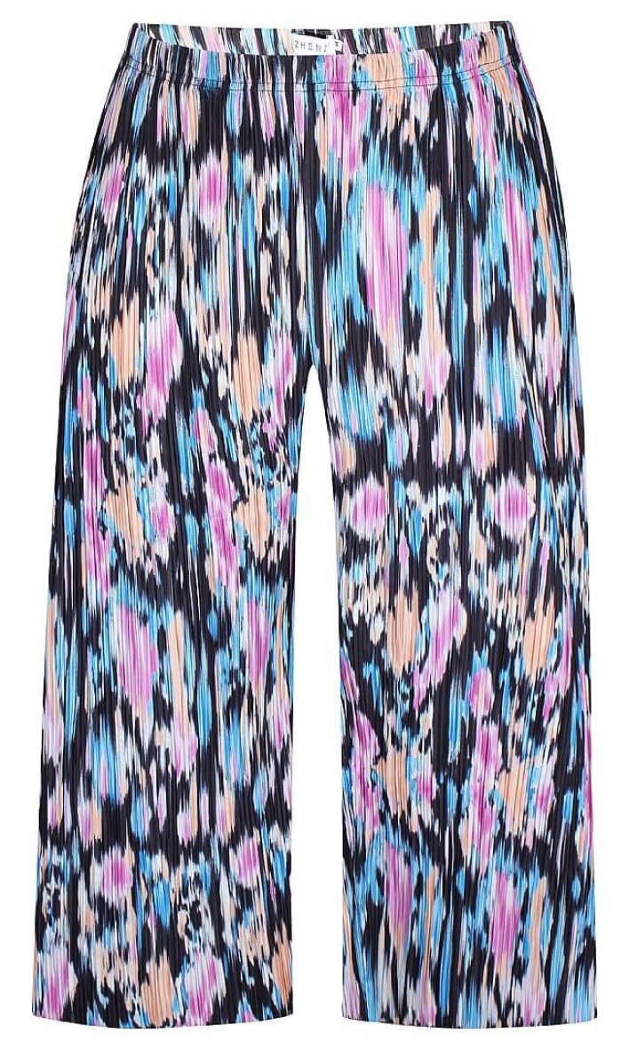 Smarte multi farvede bukser fra Zhenzi. De farverige bukser er lavet i et skønt print samt med et moderne plissé effekt i materialet. Buksen er med elastik i talen og brede bukseben med en rå kant. Buksen er lavet i en 7/8 del længde.