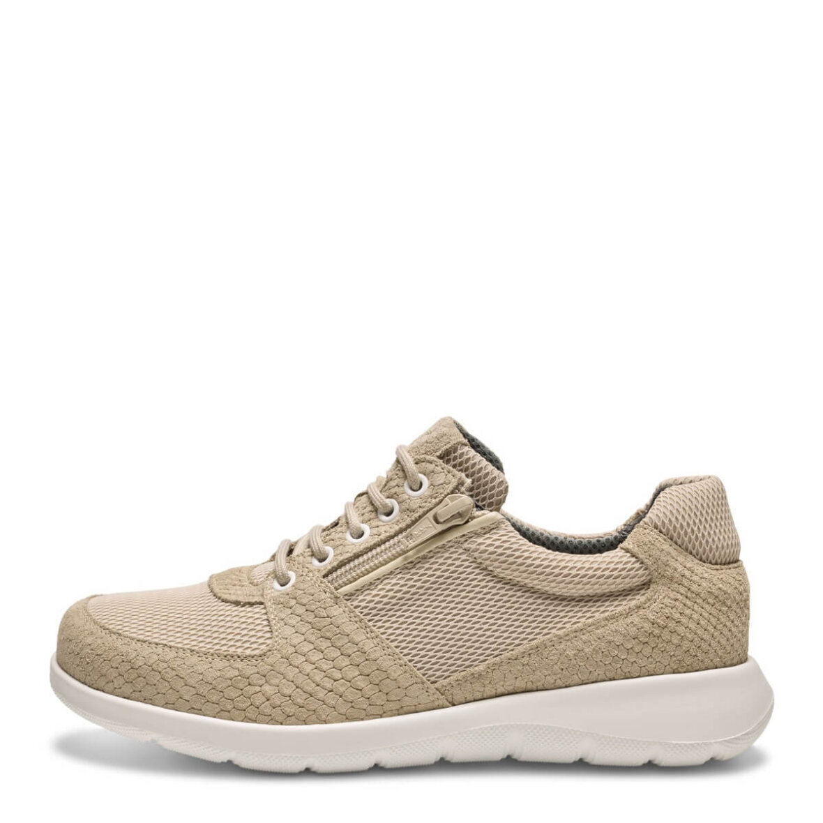 Komfortabel sandfarvet sneaker fra New Feet. Skoens overdel er lavet i en kombination af skind med struktur og mesh tekstil, som giver en god åndbarhed.
