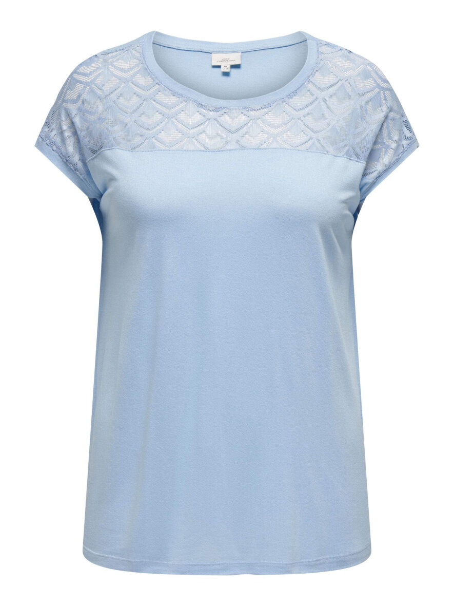 Sød lyseblå t-shirt fra ONLY Carmakoma. T-shirten er fint dekoreret med blonder på den øverste del af t-shirtens front.