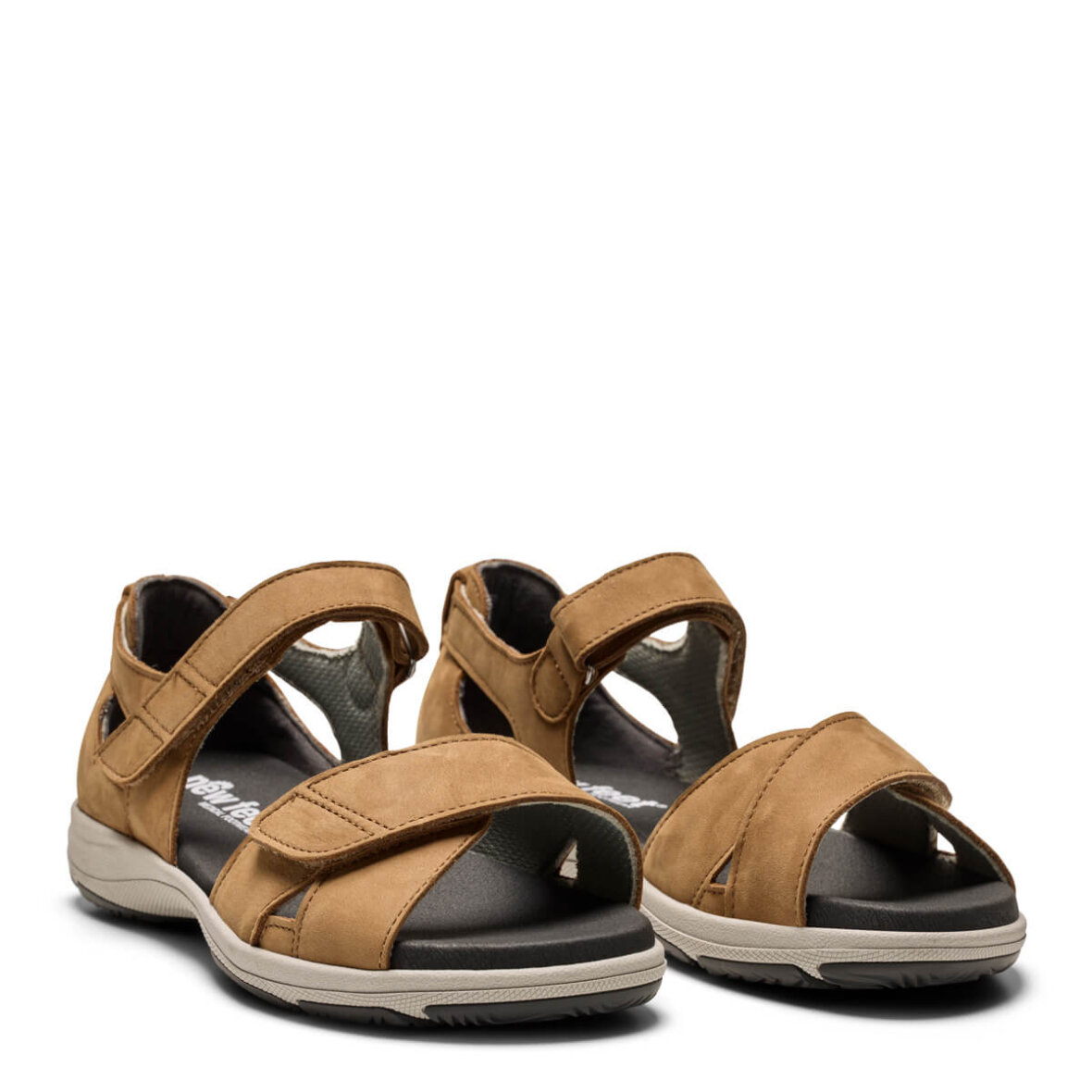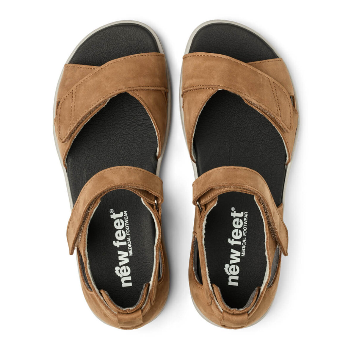 Komfortabel sandal fra New Feet i en skøn brun farve. Sandalen er lavet i brun nubuck. Sandalen er med to kryds remme over forfoden, hvor den ene kan reguleres med velcro samt en ankelrem med velcro luk, så sandalen kan tilpasses til netop din fod. Sandalen er tilmed med hælkappe, som giver dig den bedst mulige stabilitet.