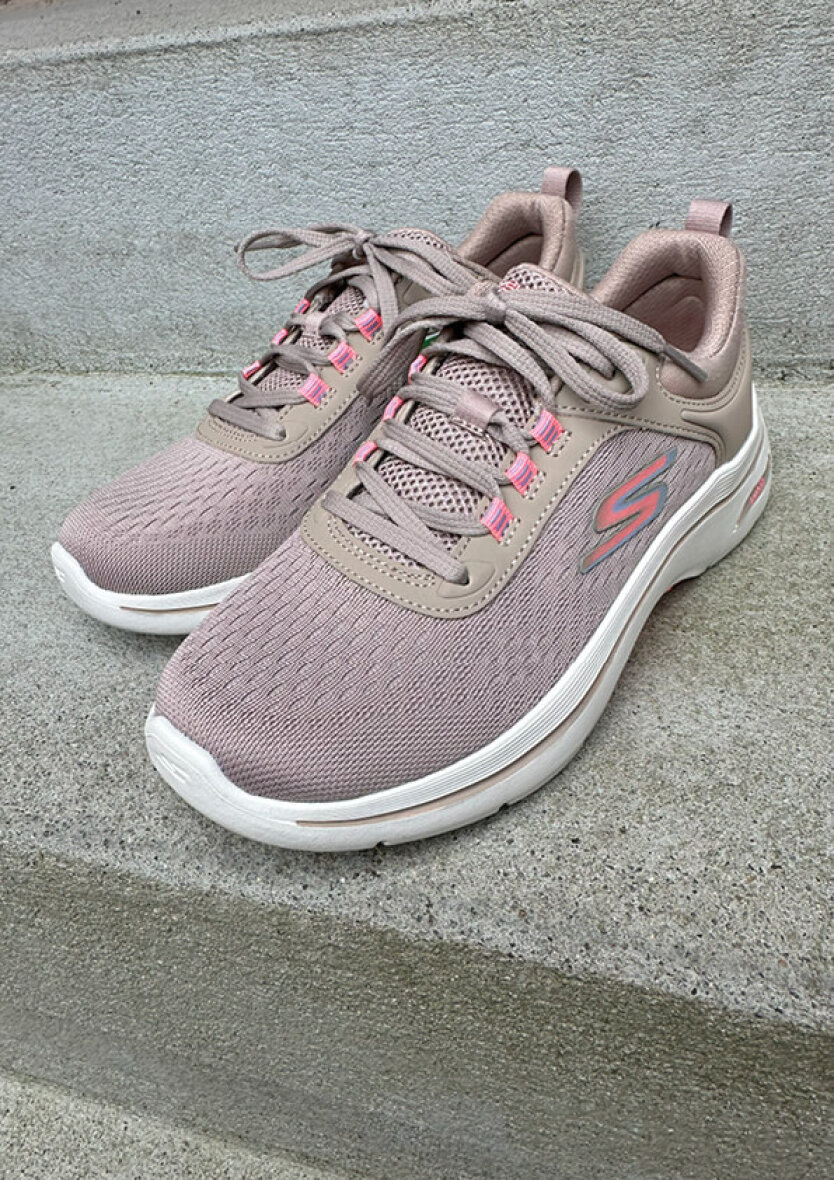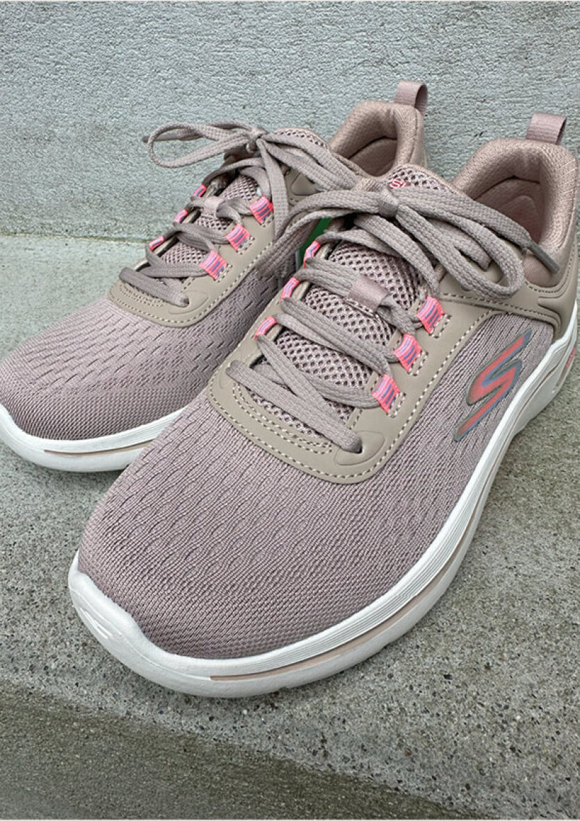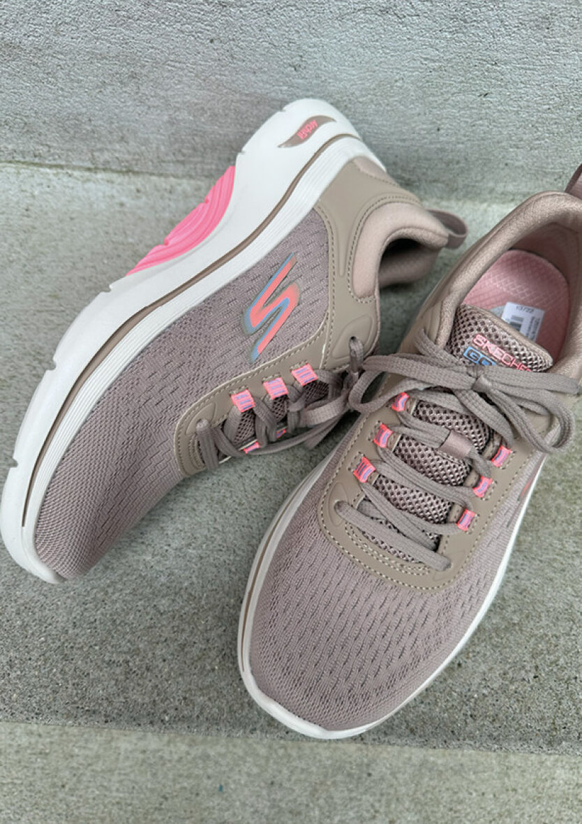 De skønneste lette sneakers fra Skechers i en flot taupe farve med lyserøde elementer.