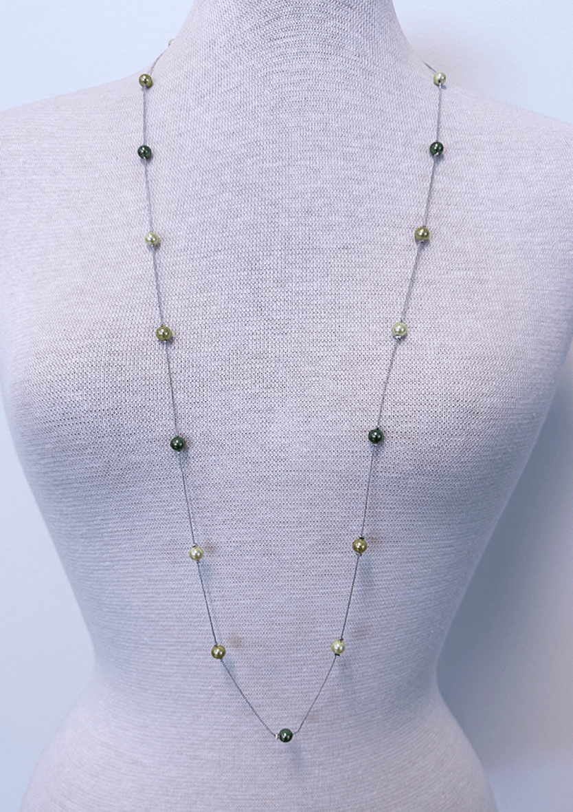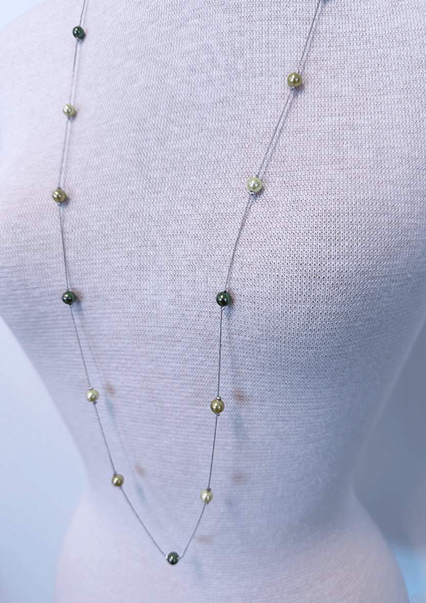 Flot og elegant halskæde fra JK Necklace. Halskæden er lavet i sølv metal med små fine 6mm perler i et flot mix af grønne nuancer.