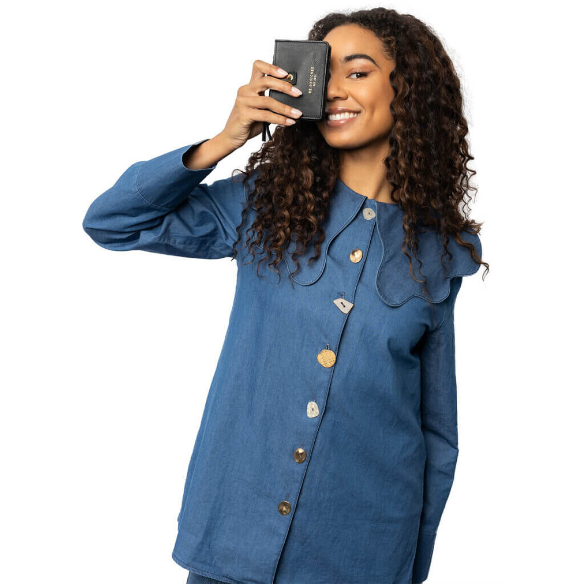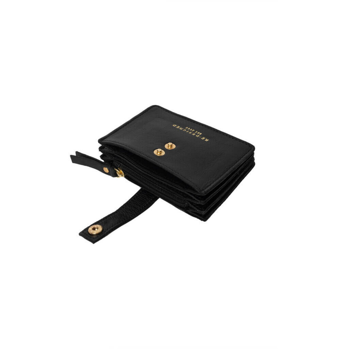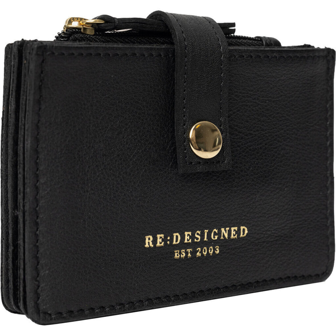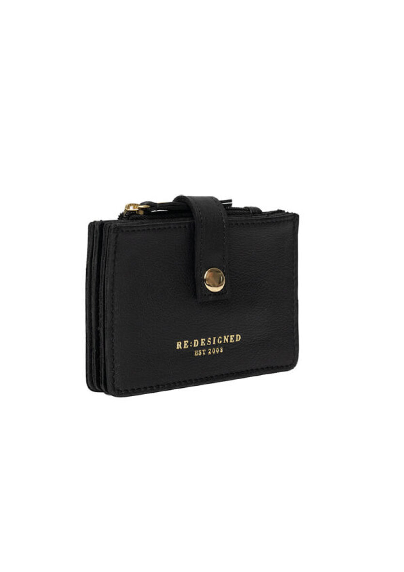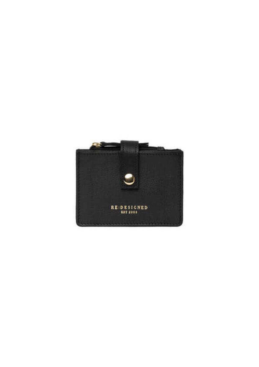 Pungen er kreditkortstørrelse med tre rum og en lynlås lomme til evt. mønter. Pungen lukkes med en strop og trykknap. En fin detalje er Re:Designed logo tryk på forsiden i guld tryk.
