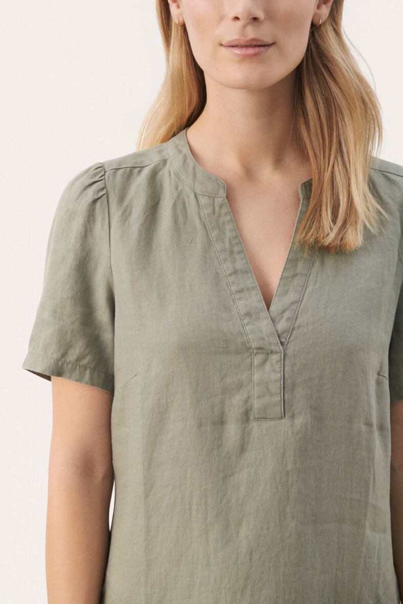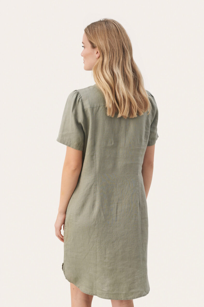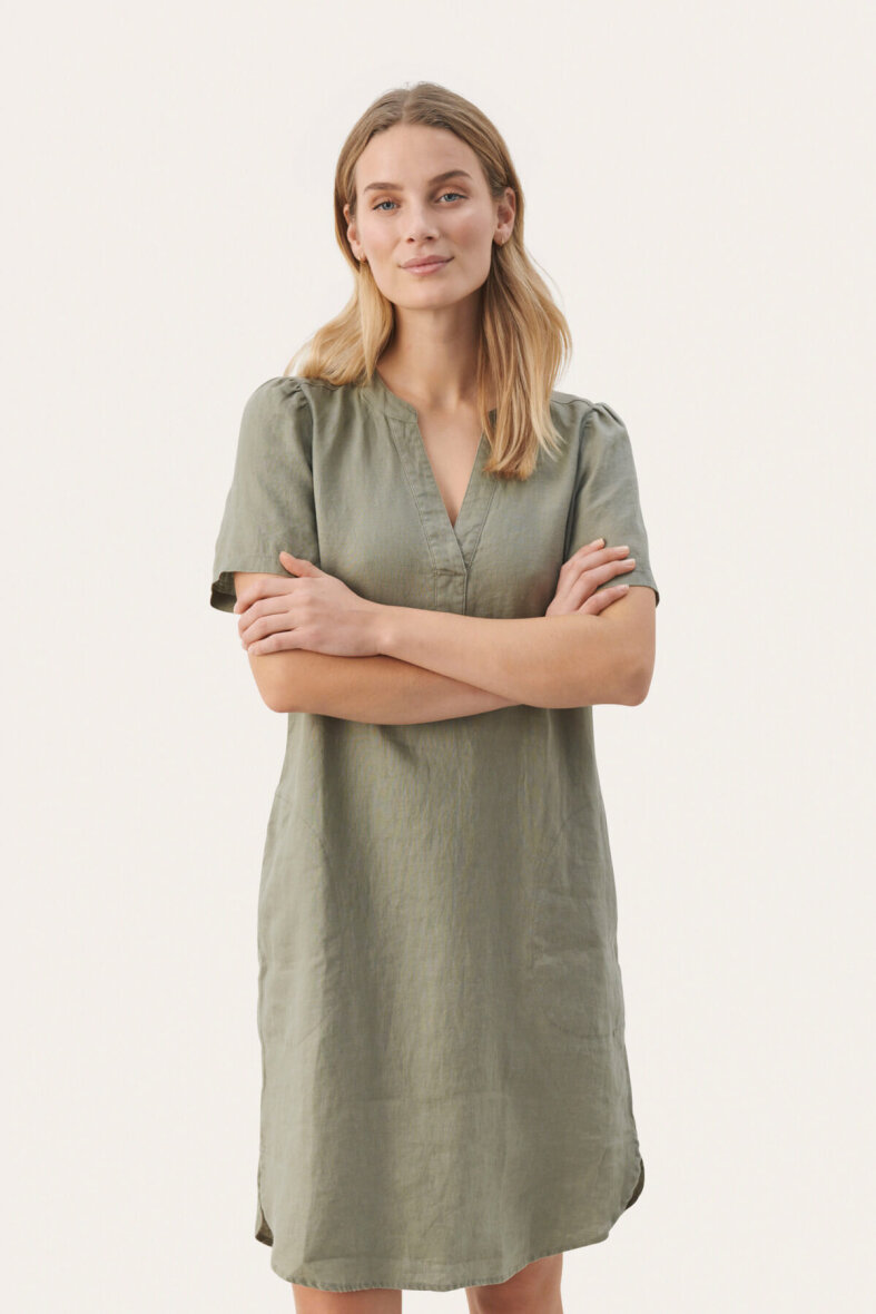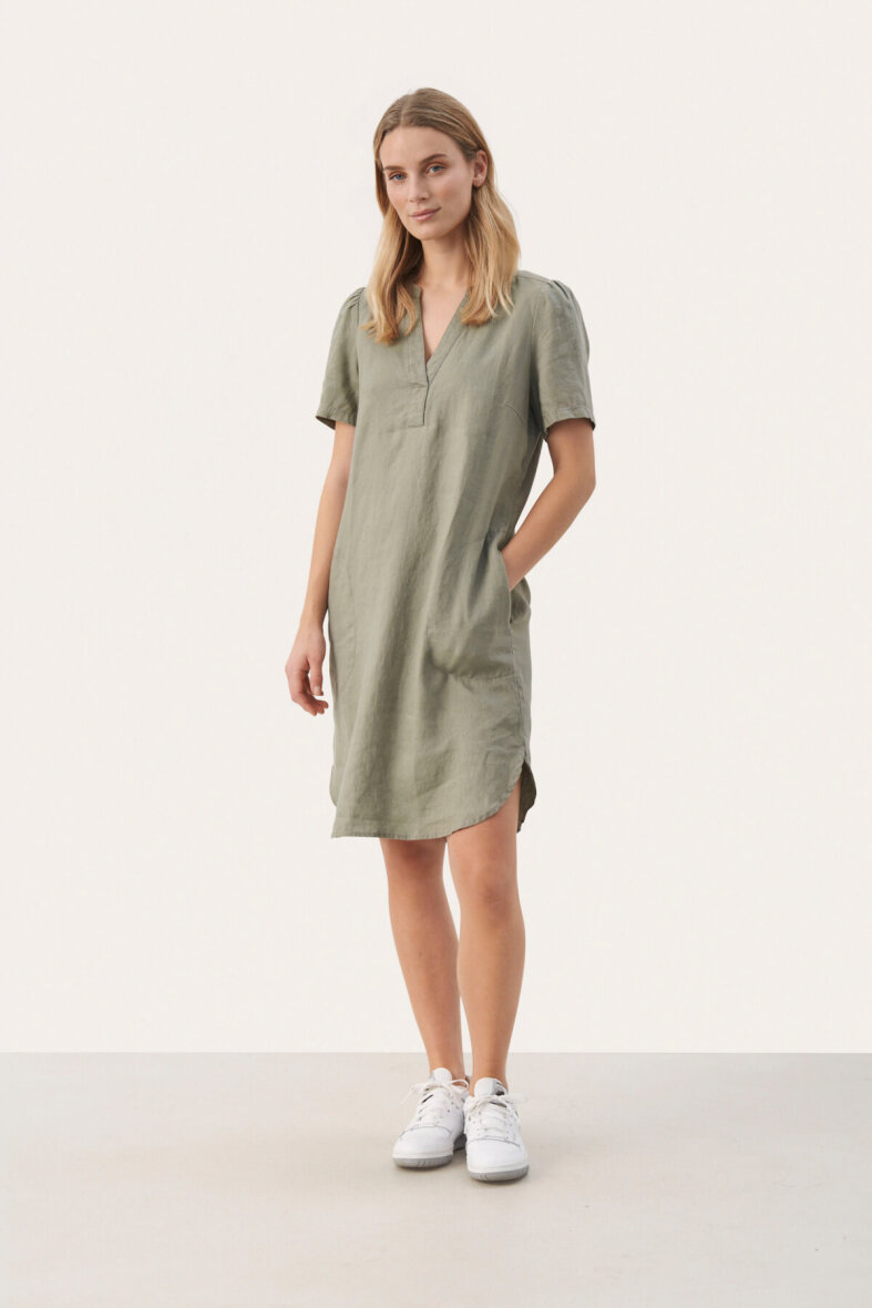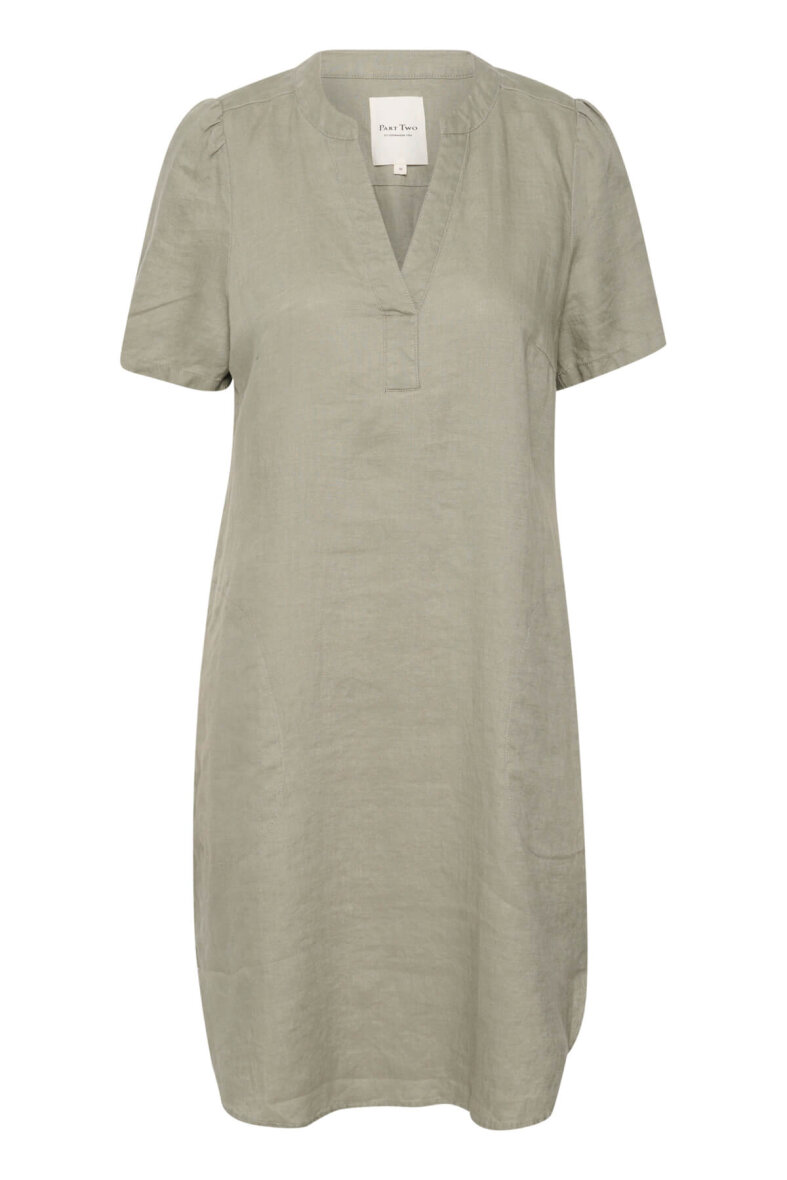 Sød og enkel kjole i en flot army grøn farve fra Part Two. Kjolen er med v-halsudskæring og stolpelukning.
