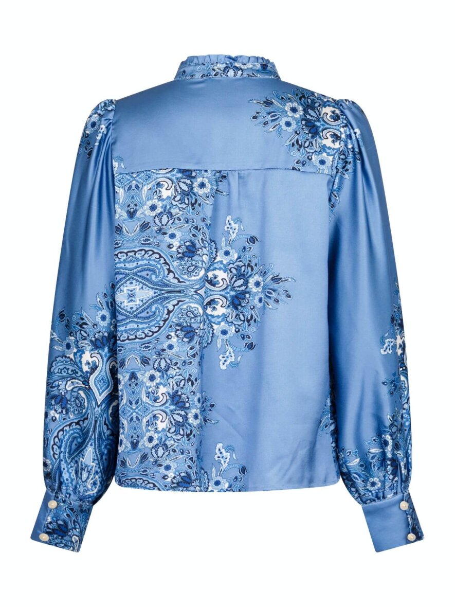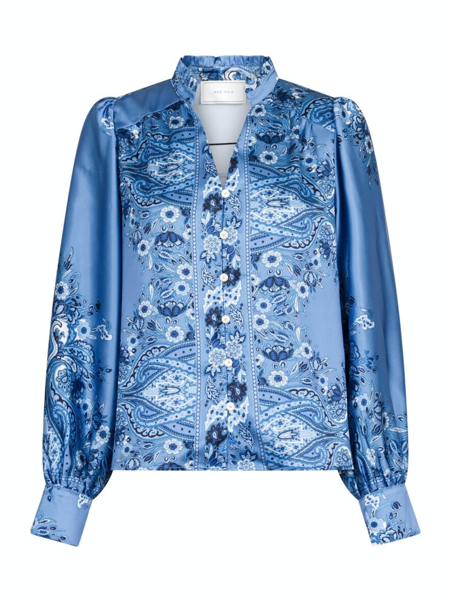 Smuk mørkeblå bluse fra Neo Noir. Massima blusen lavet i et skønt design med de fineste print i forskellige blå nuancer. Blusen er med kinakrave og v-halsudskæring som fortsætter i knapper langs fronten. Blusens lange ærmer er med dobbelt knapluk. Blusen er lavet i en silkeblød 100% polyester kvalitet.