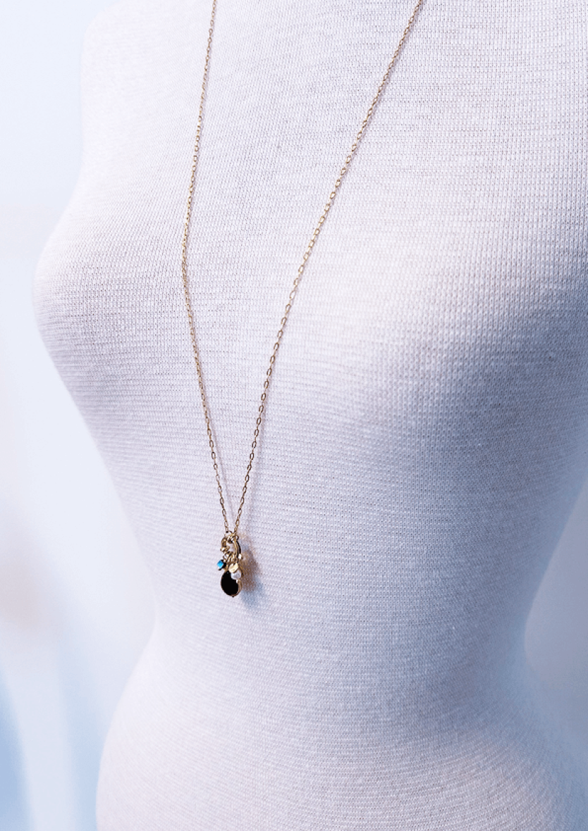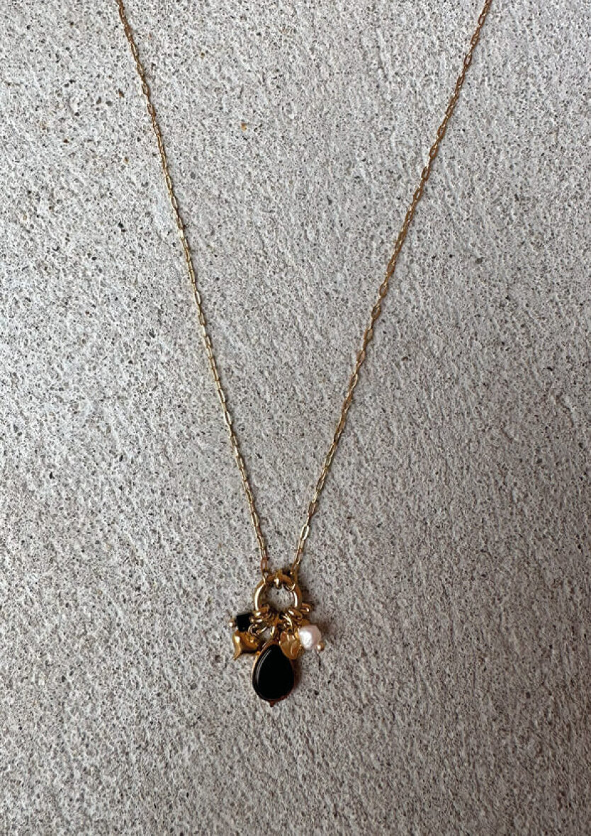 Smuk lang halskæde fra Lisbeth Merrild i guld/sort. Kæden er lavet med et flot vedhæng med fine detaljer i form af forskellige motiver, en perler og sorte detaljer.