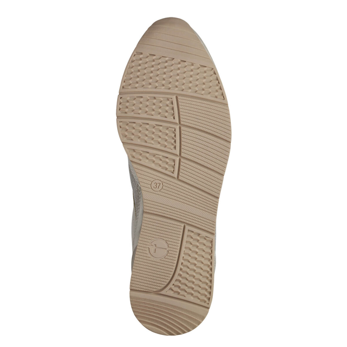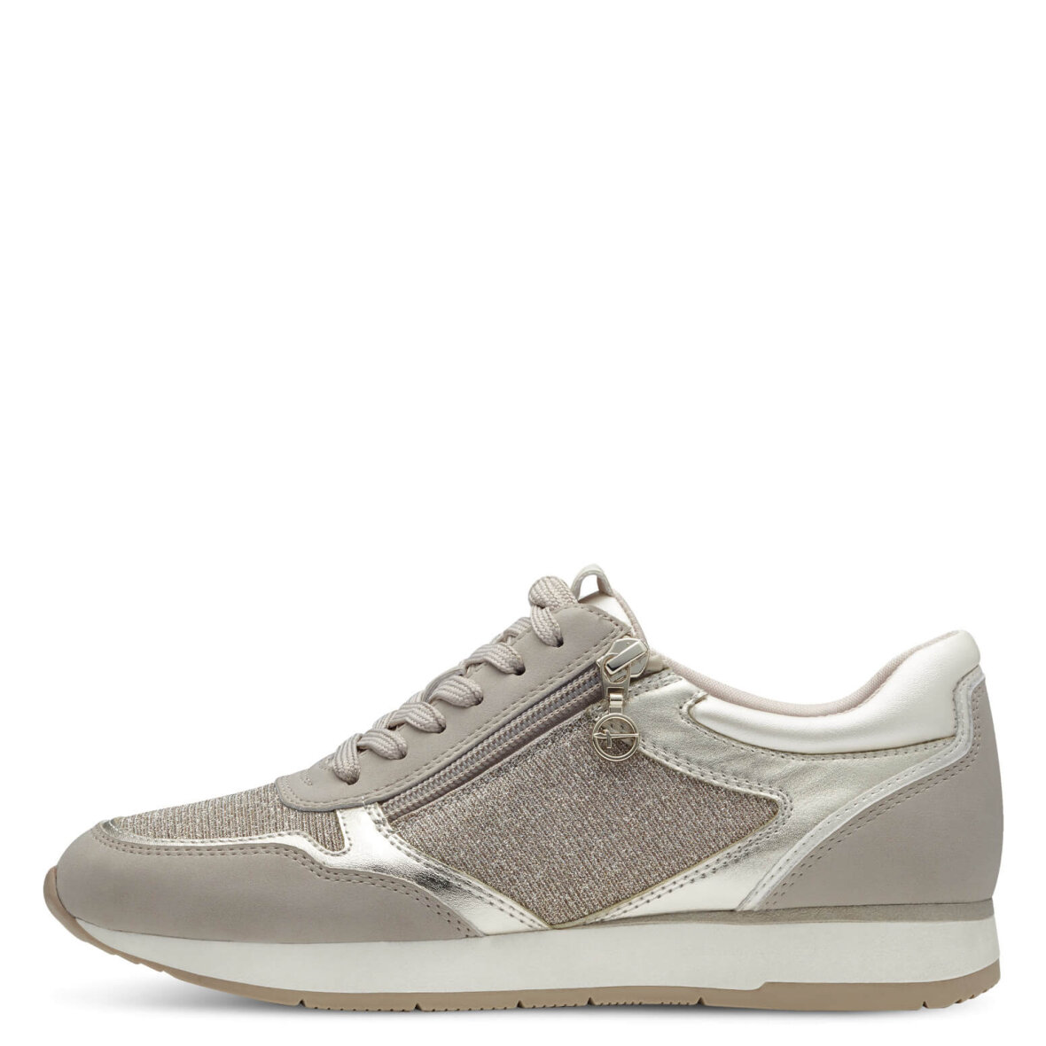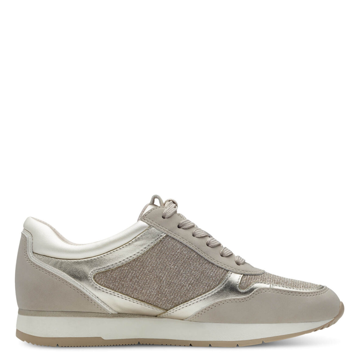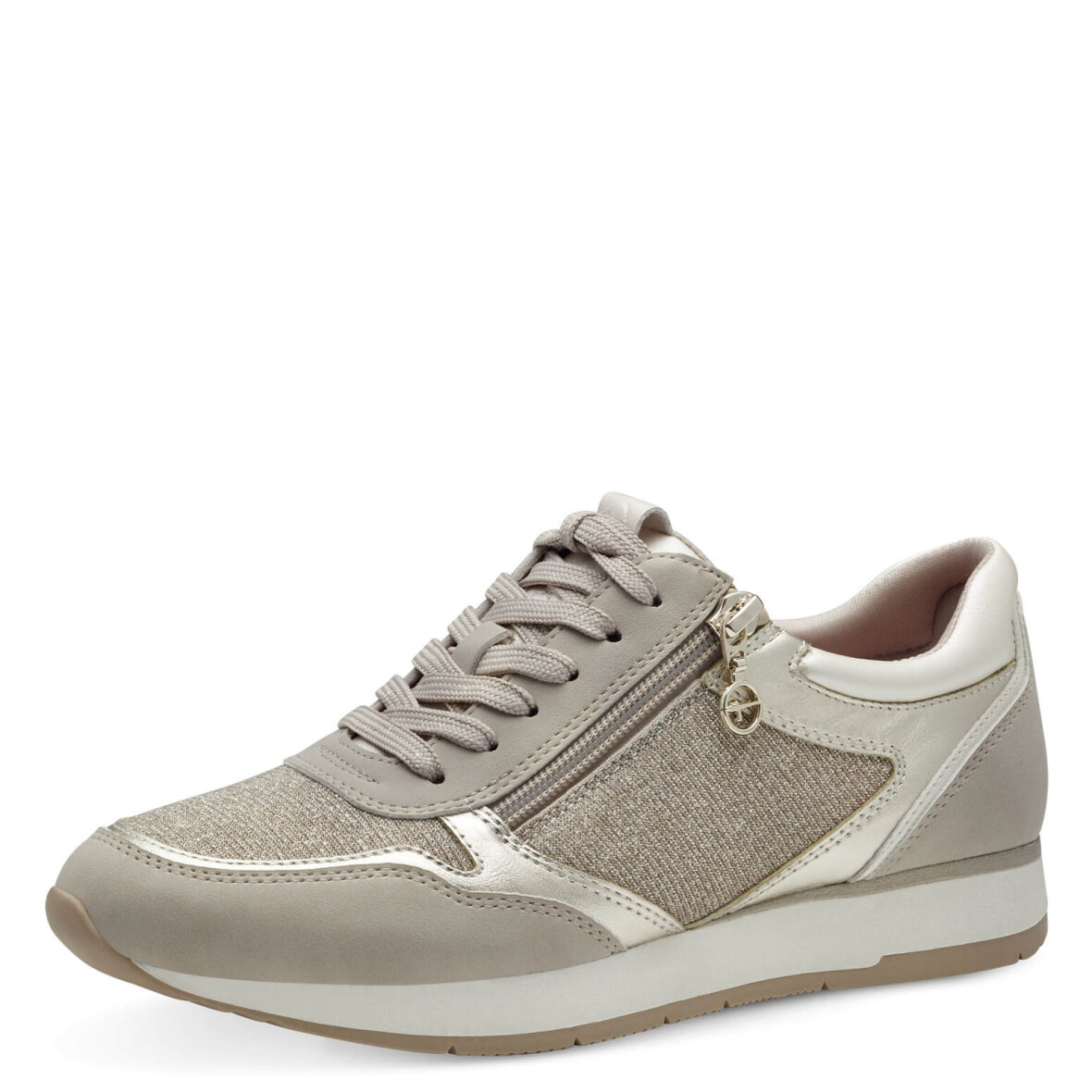Lette sneakers i en flot sandfarve med glimmer detaljer fra Tamaris. Skoen er lavet i imiteret skind med guldglimmer detaljer på siderne samt snuden.