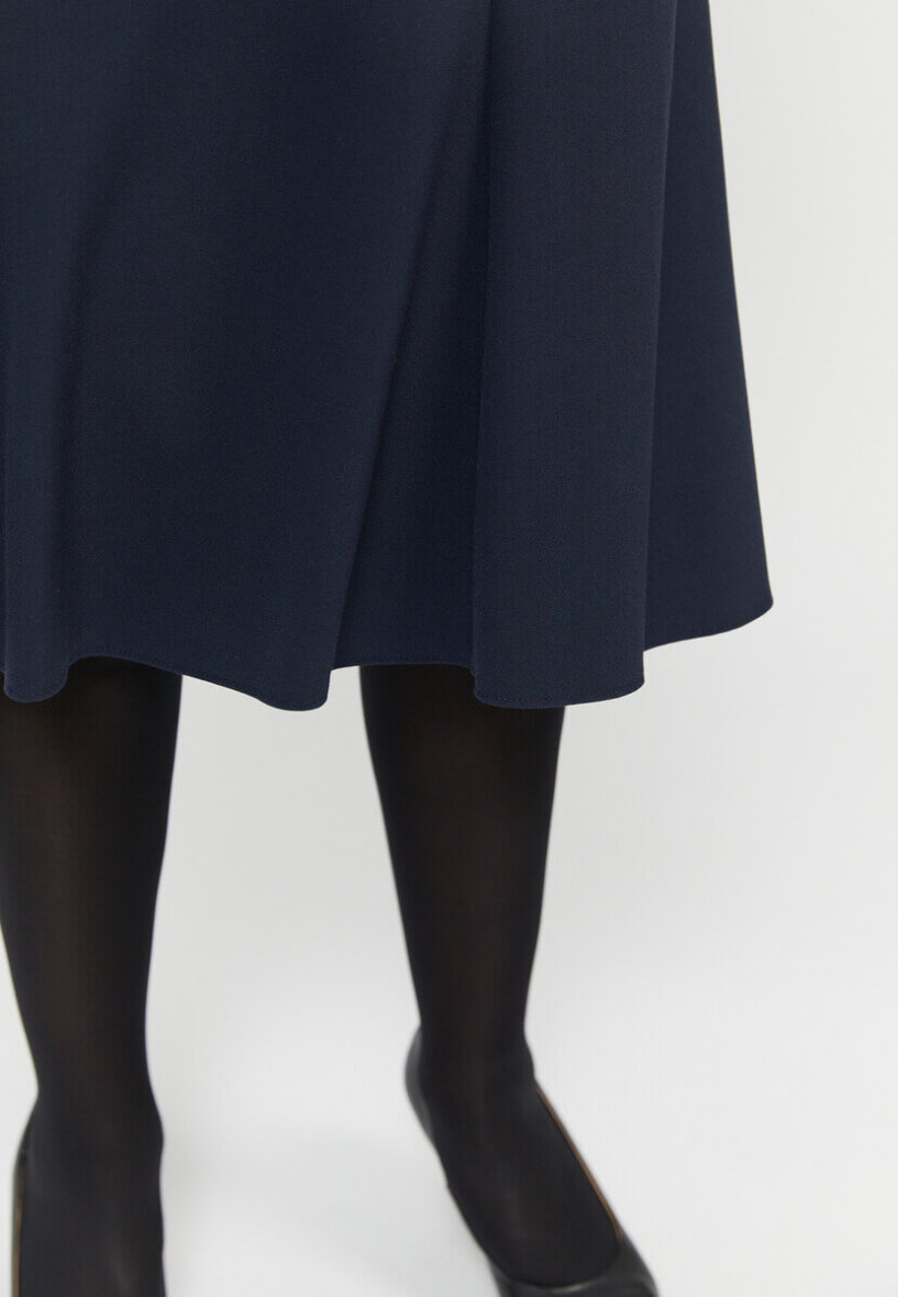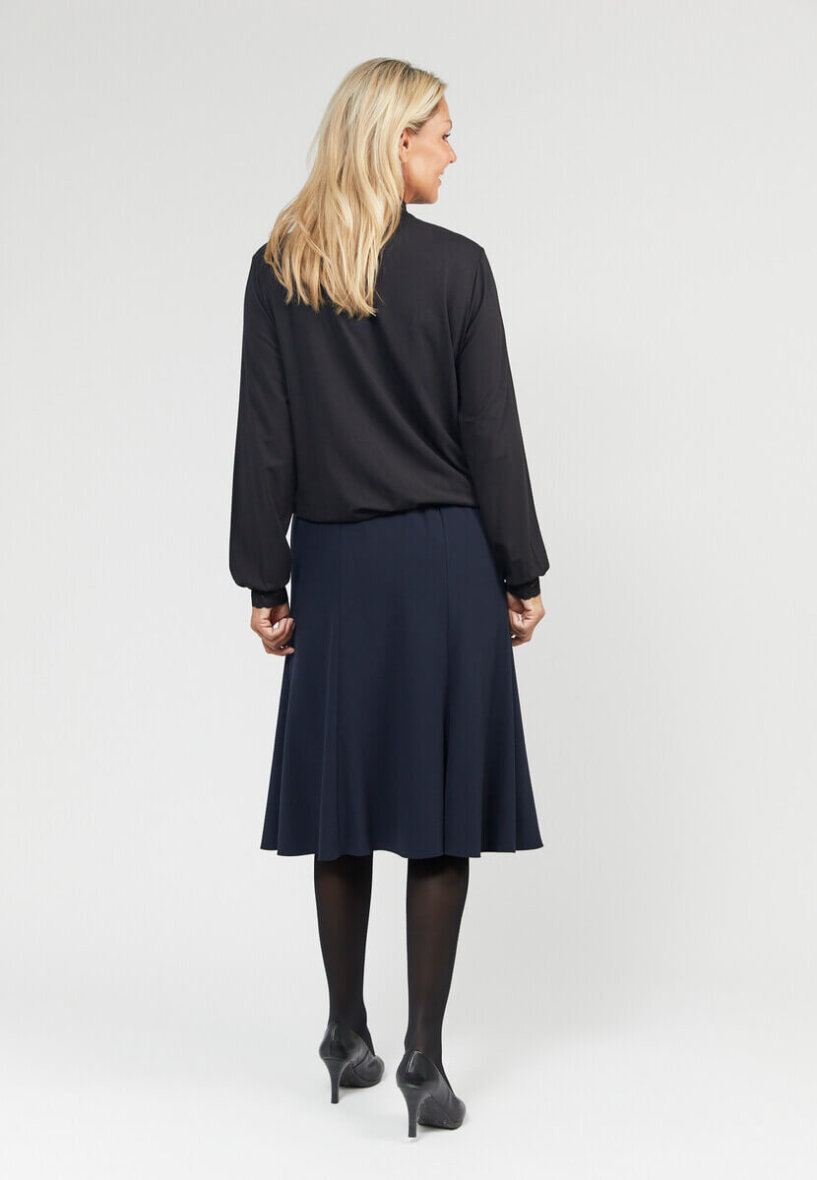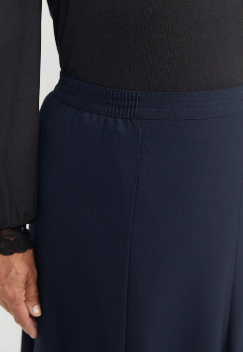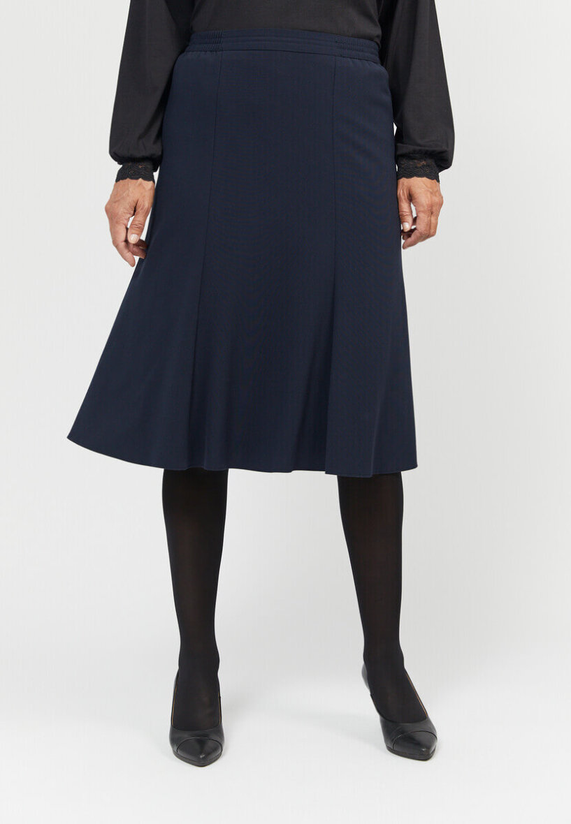 Flot mørkeblå nederdel fra Brandtex. Nederdelen er med elastikkant, så den kan sidde godt til i taljen. Nederdelen er lavet i en klassisk A-facon, som passer godt til de fleste kropstyper.