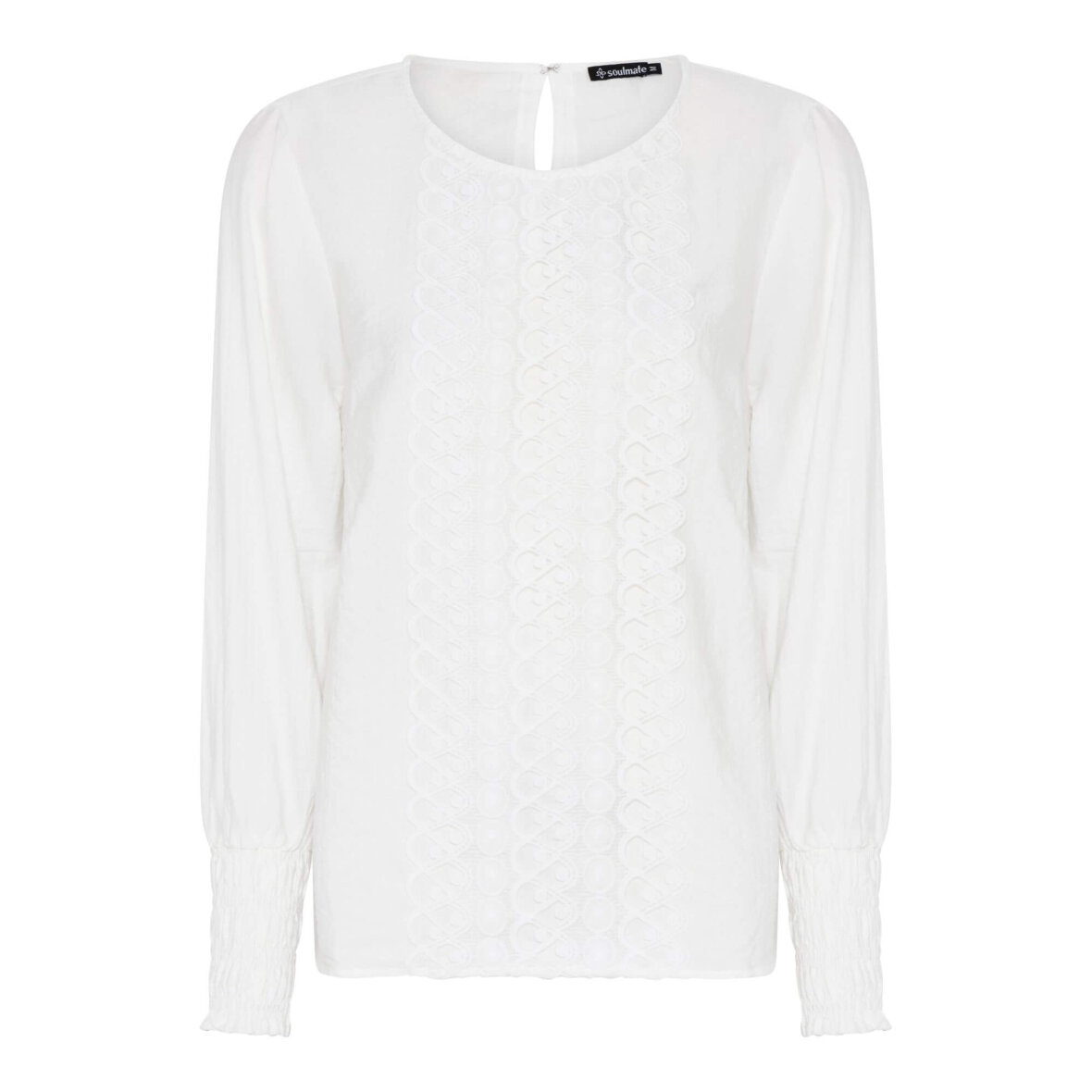 Flot og feminin bluse fra Soulmate. Blusen er med et fint og dekorativt blonde stykke langs fronten, hvilket giver et feminint udtryk. Blusen er med rund hals og lukkes med hægte lås i nakken. Blusen er tilmed med en lille nøglehuls detalje i nakken. Blusens lange ærmer afsluttes med et bredt smock stykke ved håndleddet.