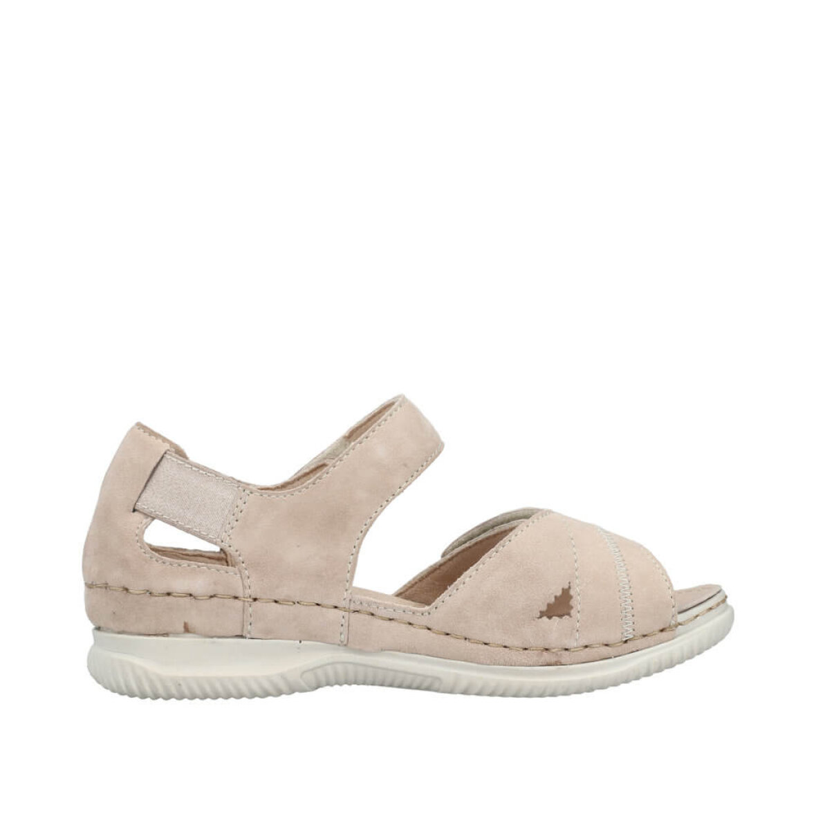 Super flot lys sandal til kvinder fra Rieker. Overdelen er lavet i en blød ruskindskvalitet. Sandalen kan reguleres med to velcroremme. En ved forfoden og en ankelrem.