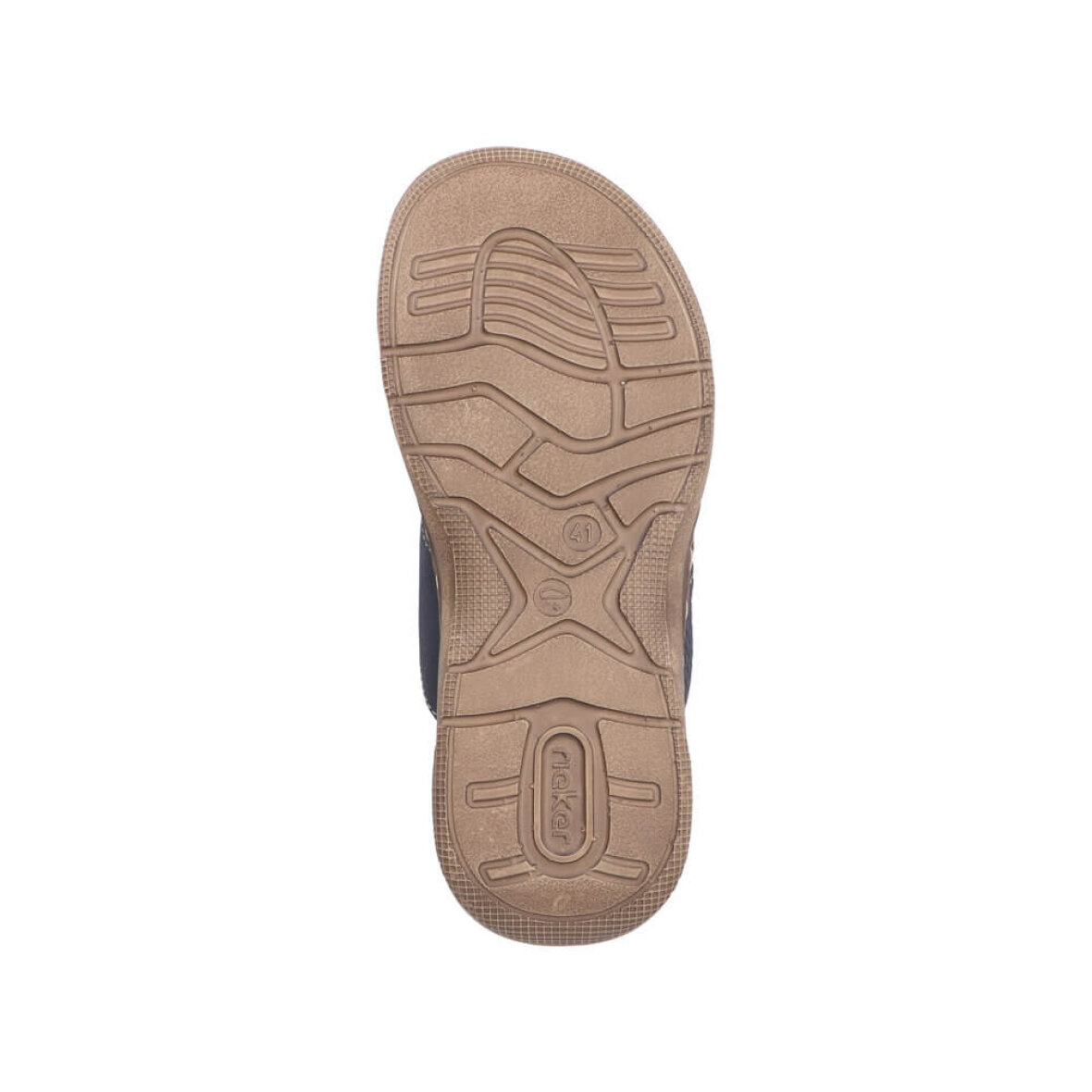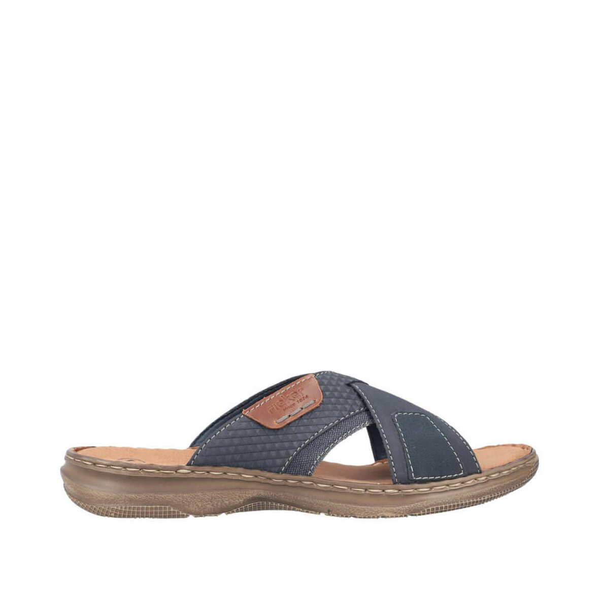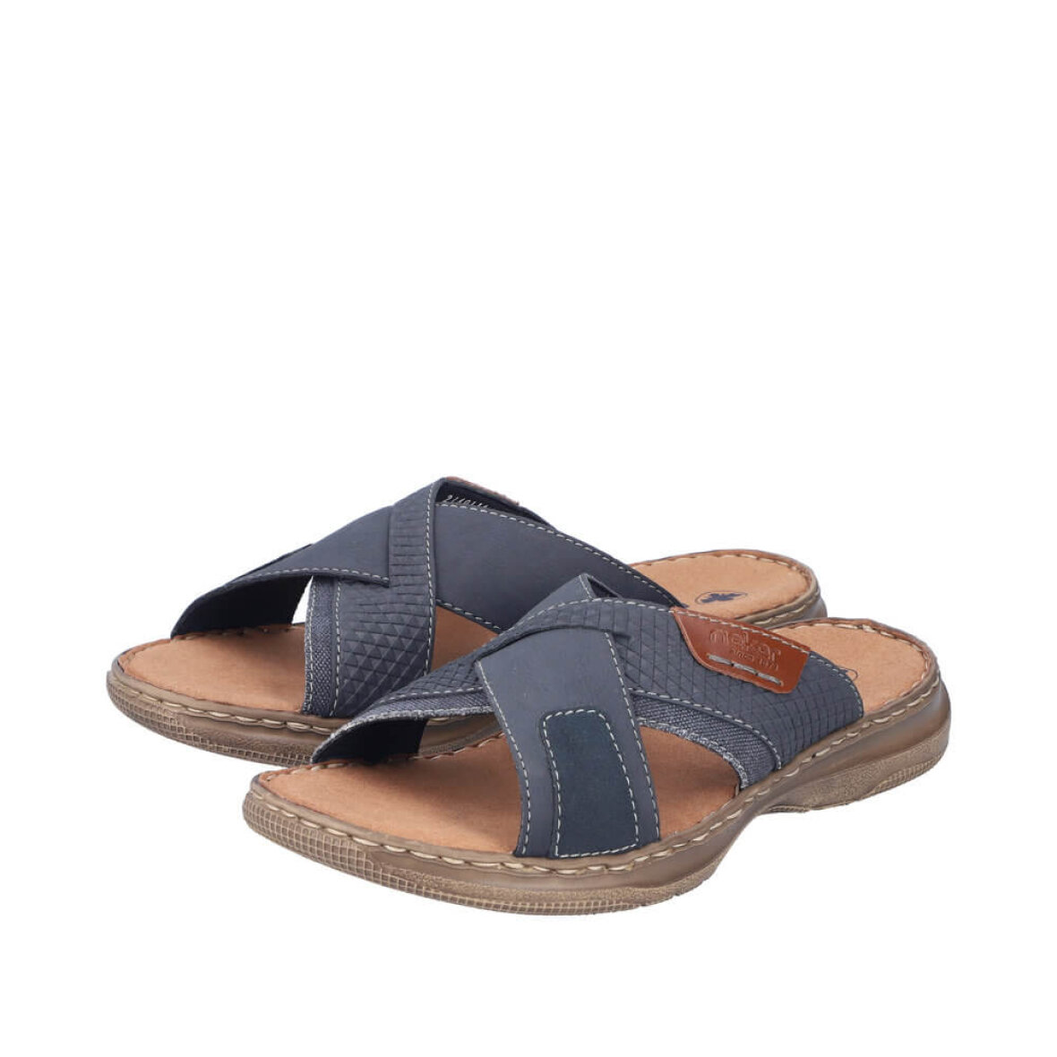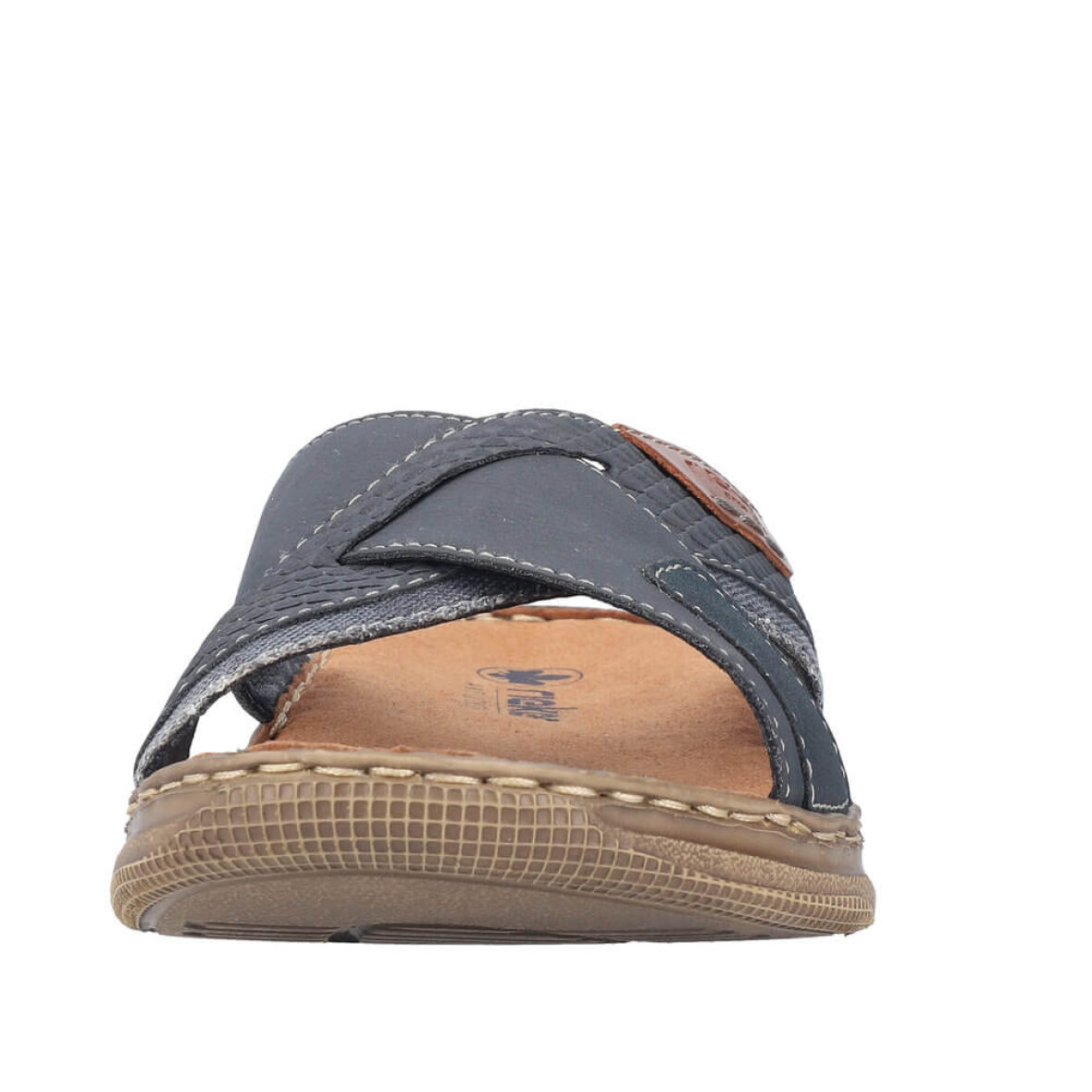 Smart herre sandal fra Rieker. Slipper sandalen er lavet mørkeblå imiteret skind med kryds remme over forfoden. Den ene rem er med trekantet mønster samt en tynd kant af denim, hvilket giver et fedt look til sandalen.