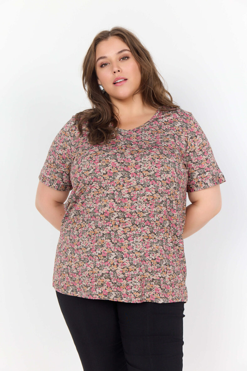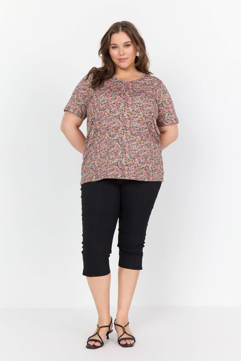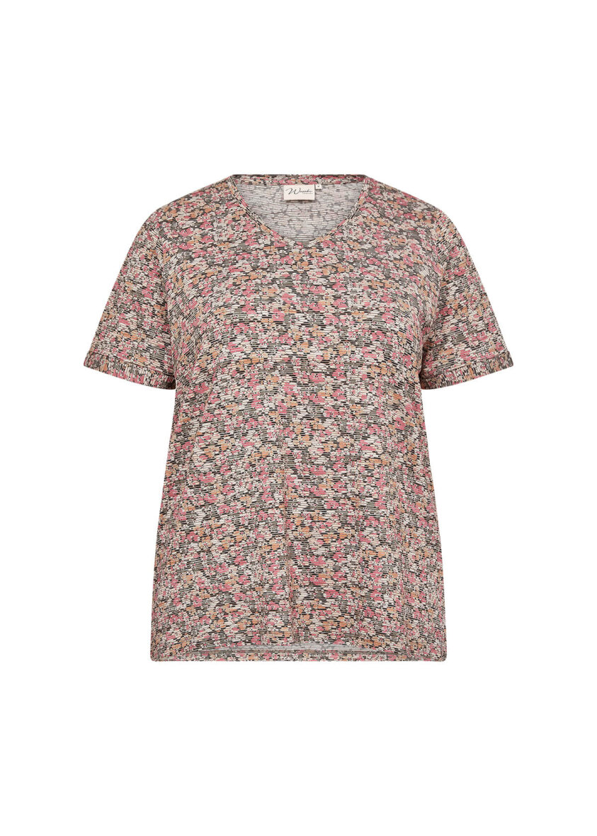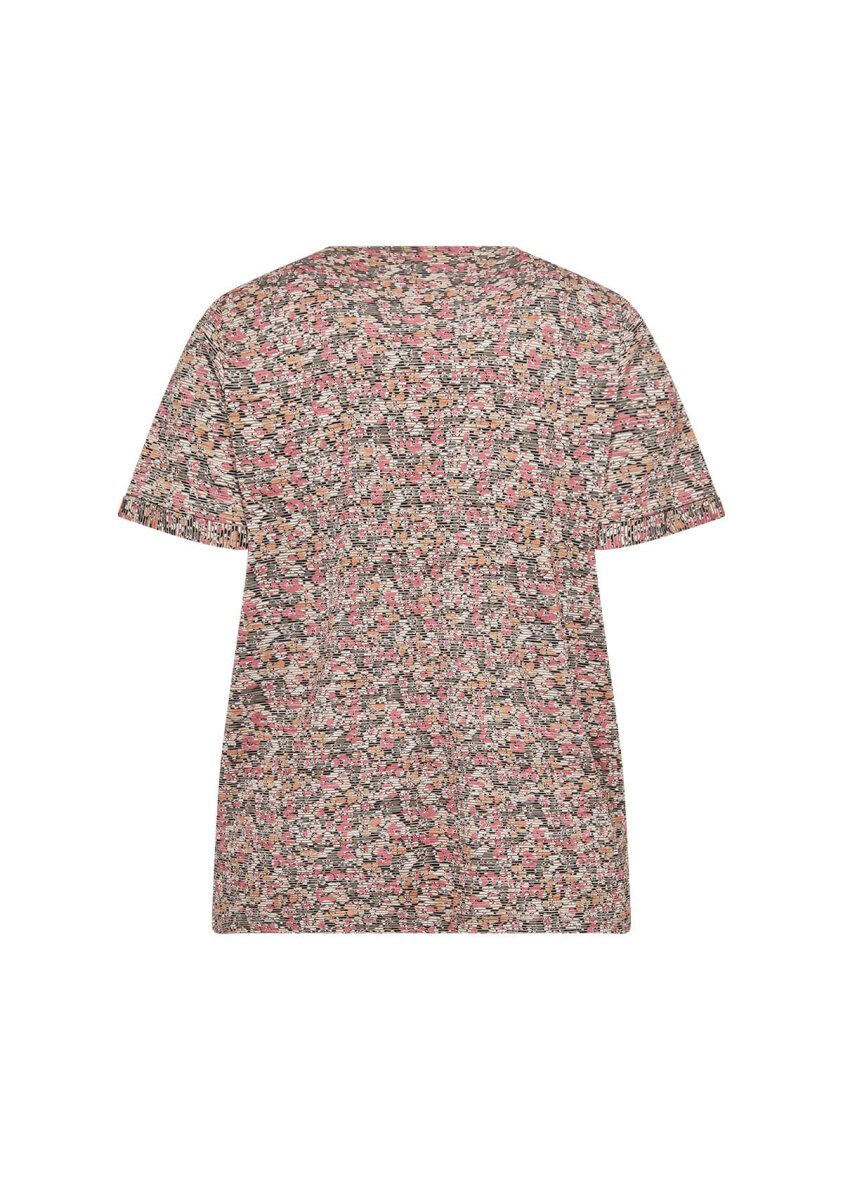 T-shirten er med v-halsudskæring og korte ærmer med opsmøg. T-shirten er med en flot afrunding nederst og er en smule længere bagtil.
