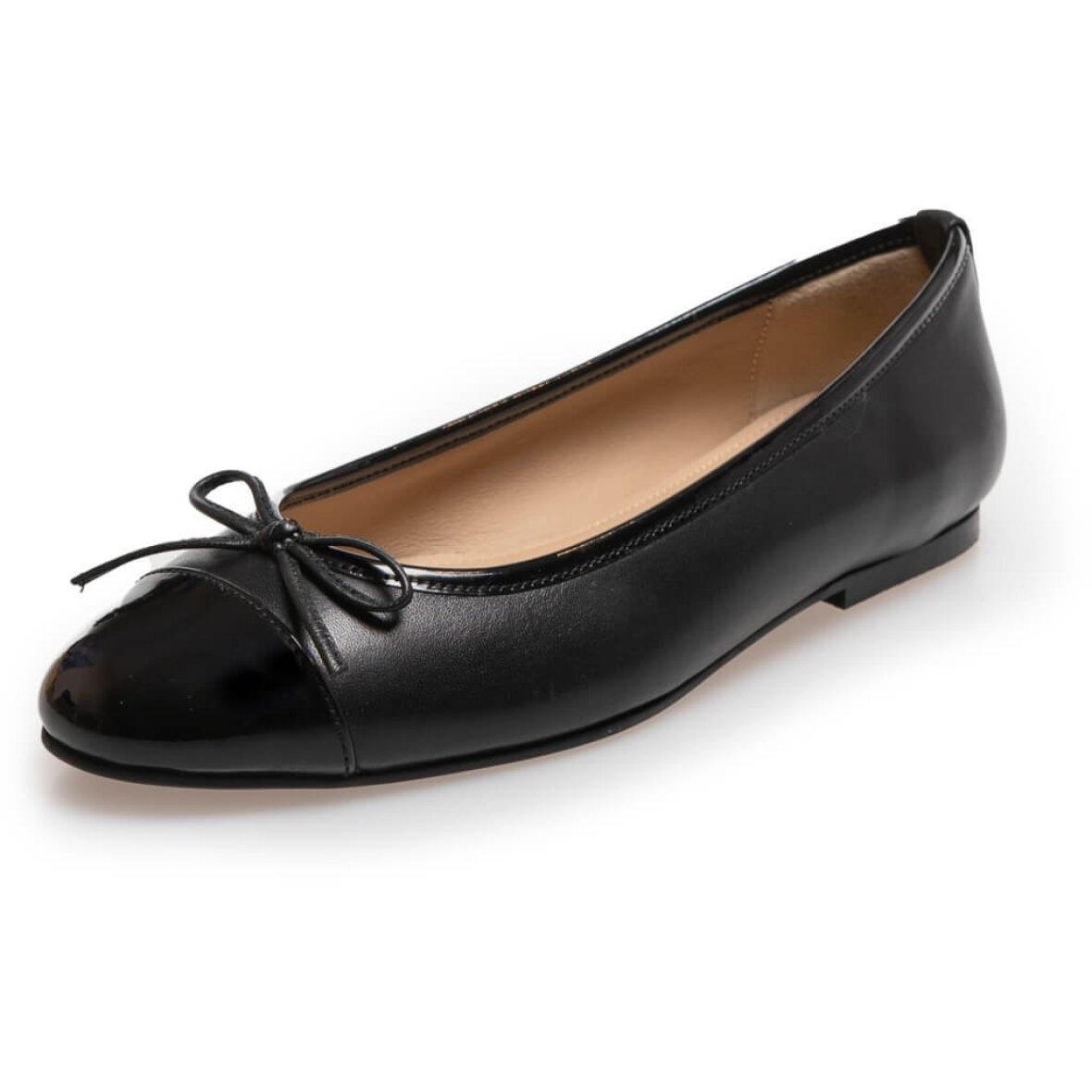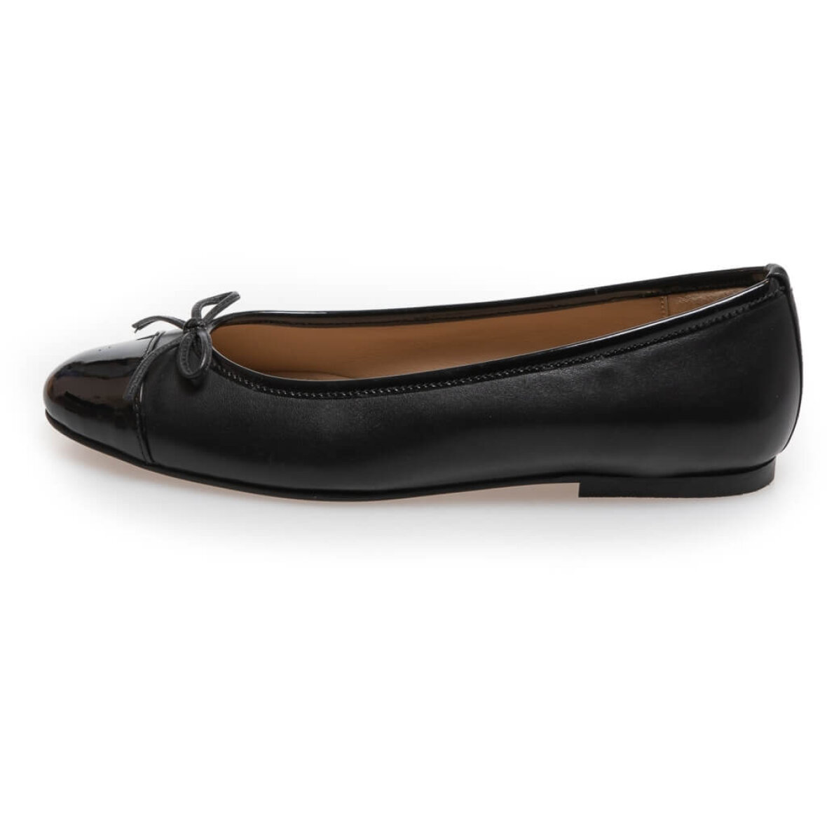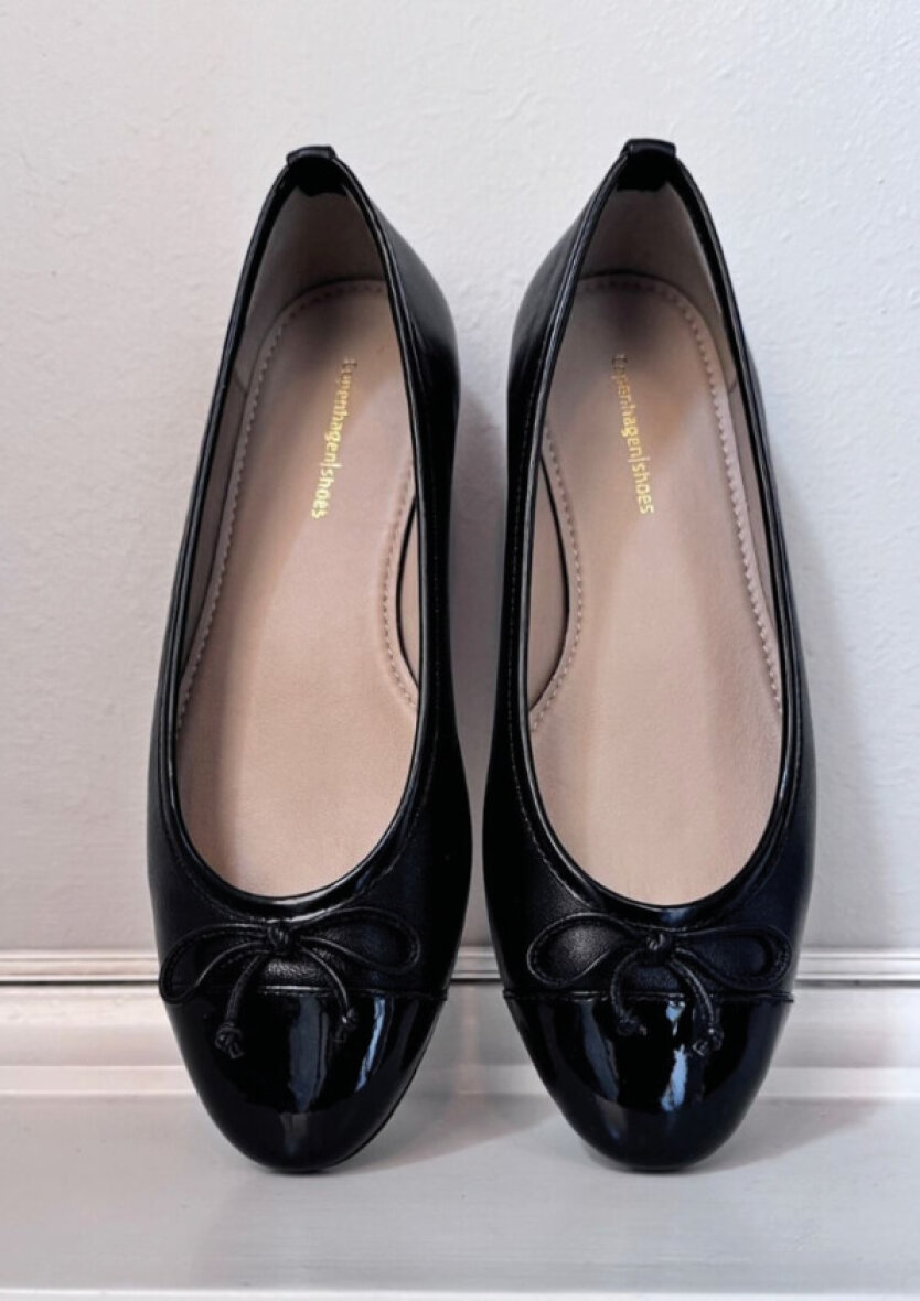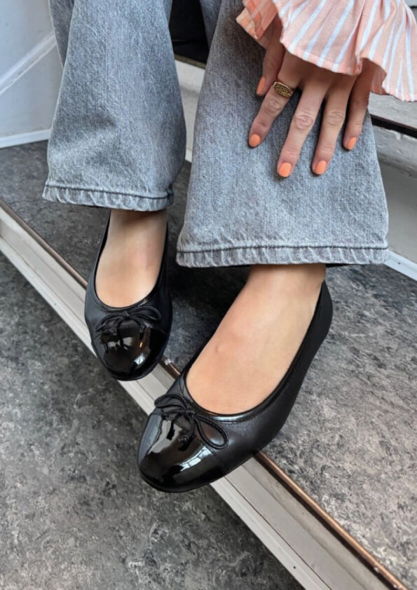 Fine ballerina sko fra Copenhagen Shoes. Skoen er lavet sort glat skind med en snude med laklook i patent skind. Skoen er med en sød lille sløjfe.