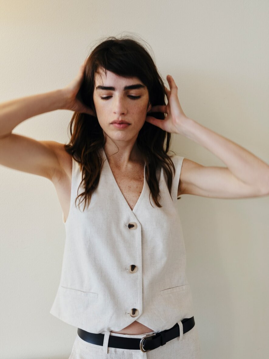 Lækker sandfarvet vest fra VILA. Vesten er lavet i et flot og enkelt design. Vesten er uden ærmer og v-halsudskæring som fortsætter i knapluk foran. Vesten er med pyntelommer foran og et flot snit, hvor vesten er en anelse længere foran.
