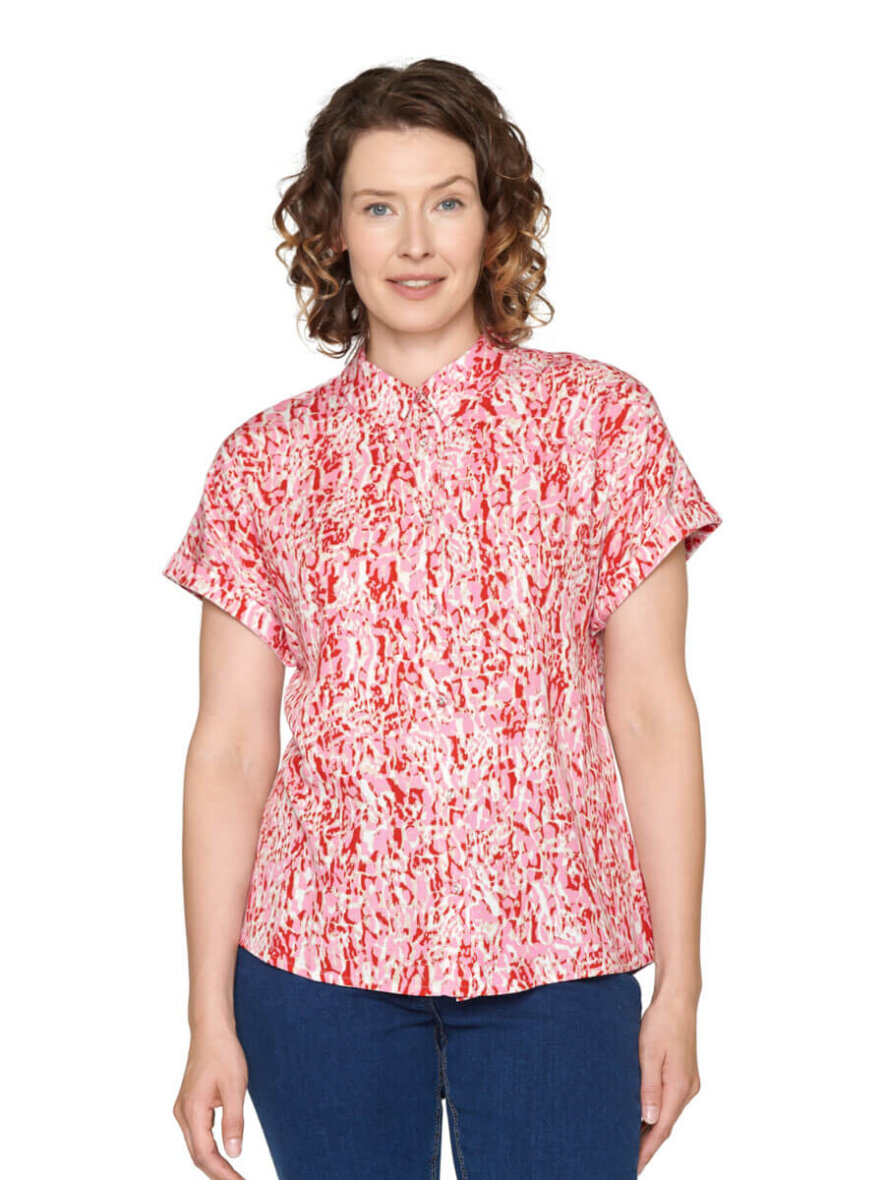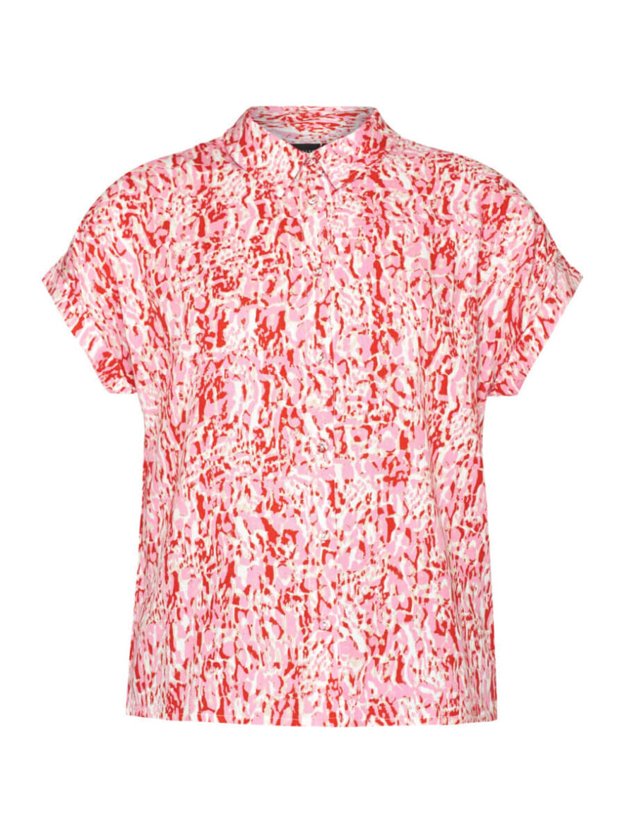 Flot og farverig bluse fra Brandtex. Blusen er lavet i et flot grafisk print i rosa/røde nuancer.