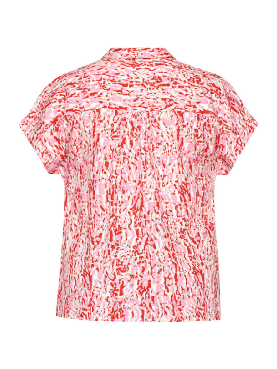 Blusen er med krave og gennemgående knapper foran. Blusen er med korte ærmer med opsmøg.
