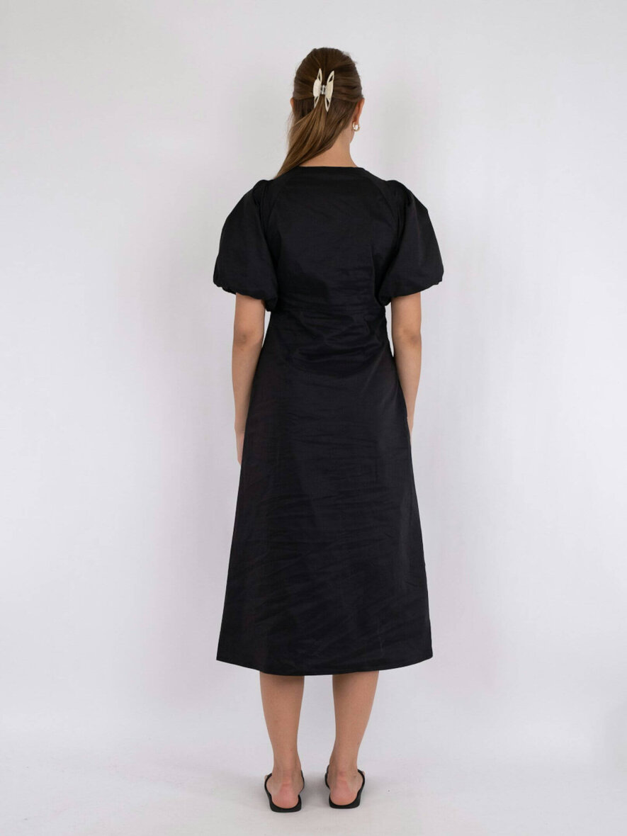 Kjolen har fine puf ærmer, som giver en flot ballon effekt. Kjolen er også lavet med en overskæring under brystet og er faconsyet i taljen, hvilken giver en flot faconsyet silhuet.