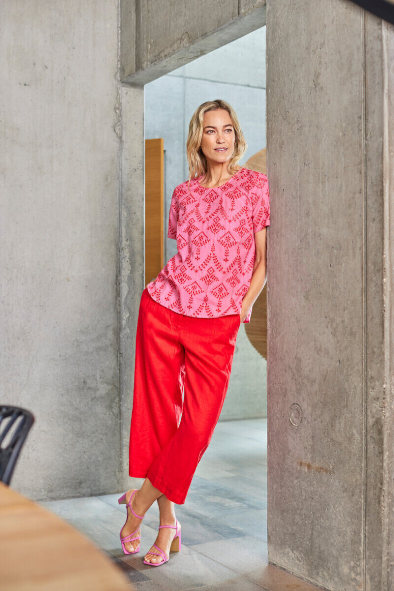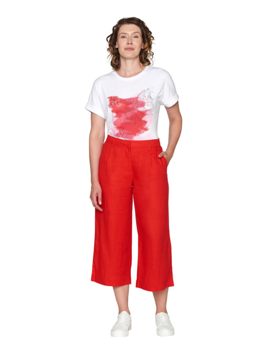 Smarte og komfortable culotte bukser fra Brandtex i en flot rød farve. De korte bukser er lavet i en skøn 100% hør kvalitet, som er yderst behagelige at have på.