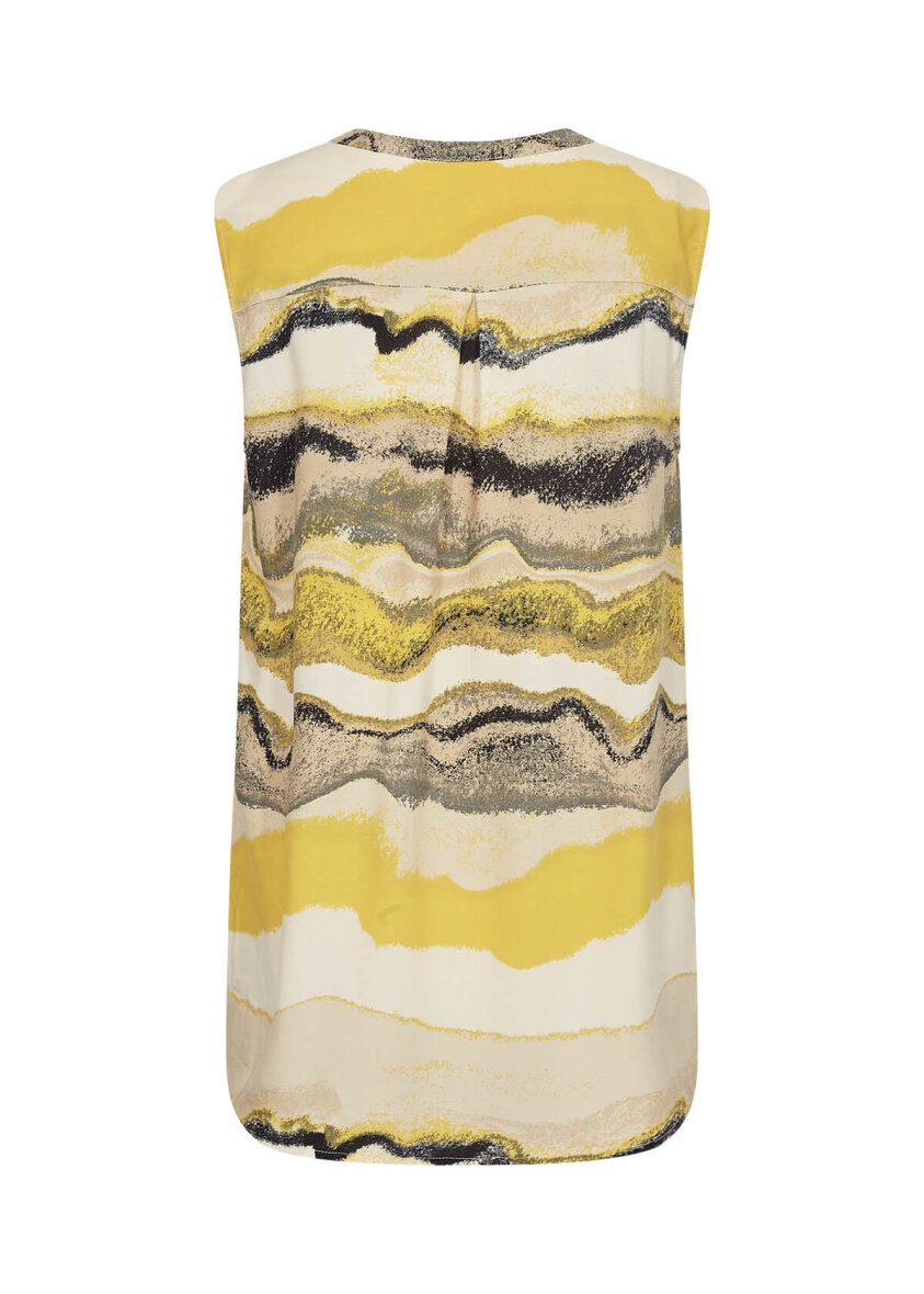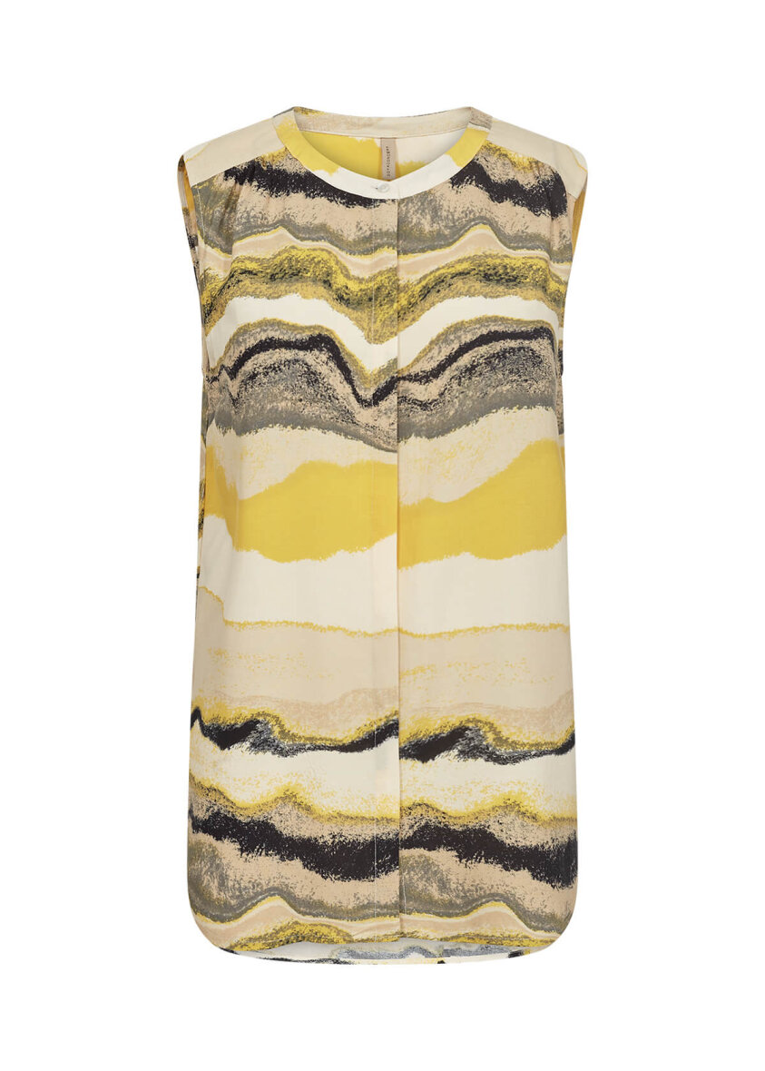 Sød sommertop fra Soyaconcept i et skønt grafisk print. Toppen er lavet i en flot farvekombination af gule toner. Toppen er med en overskæring som danner fine små læg ved skuldrene.