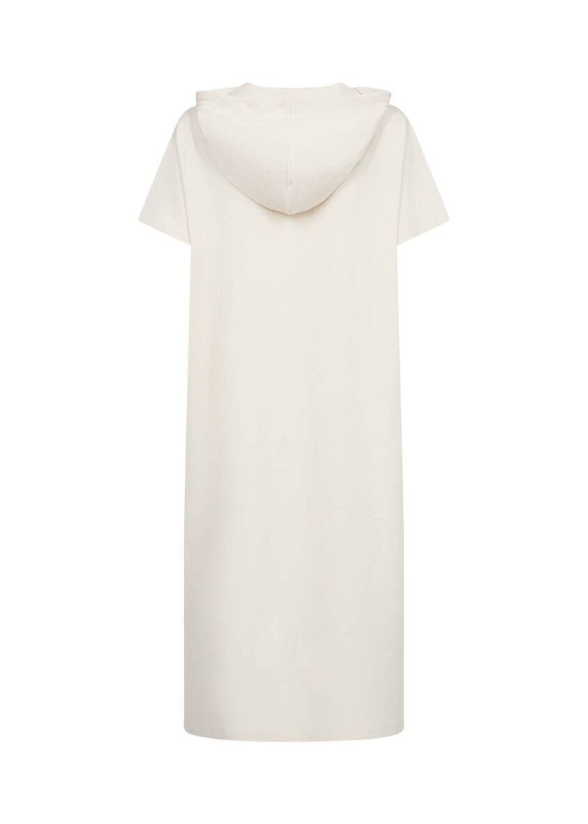 Kjolen er med hætte og bindebånd og en åben lomme på midten. Kjolen er med korte ærmer. Kjolen er med slids i begge sider.