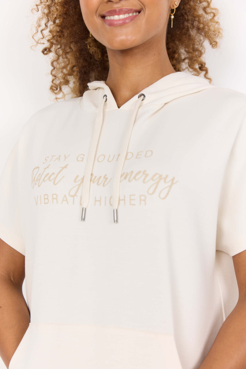 Komfortabel beige sweatkjole fra Soyaconcept. Kjolen er med tryk med let struktur på brystet.